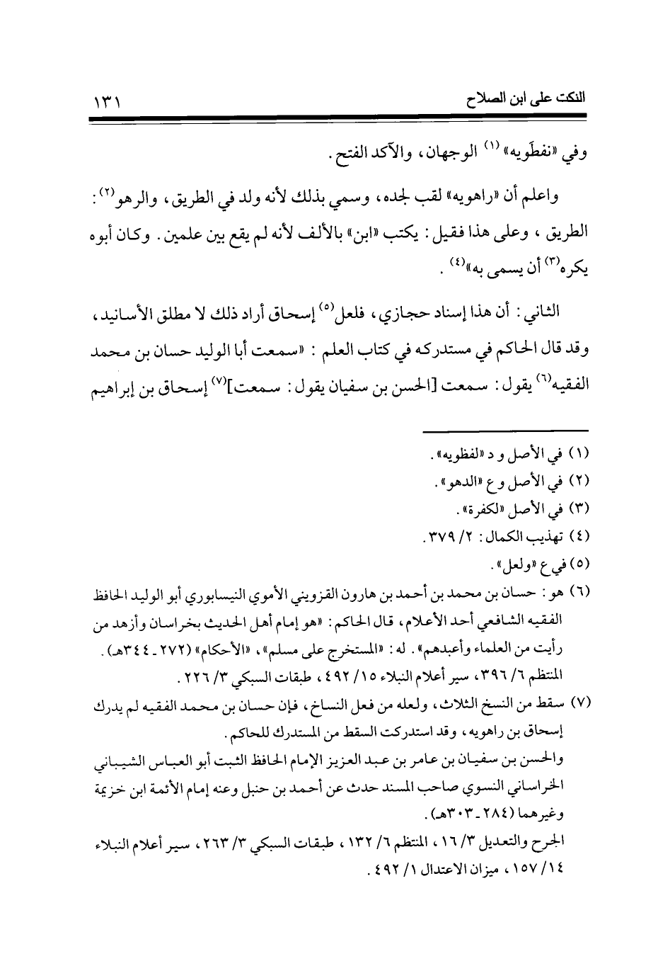 الثَّانِي أَن هَذَا إِسْنَاد حجازي فَلَعَلَّ إِسْحَاق أَرَادَ ذَلِك لَا مُطلق الْأَسَانِيد وَقد قَالَ الْحَاكِم فِي مُسْتَدْركه فِي كتاب الْعلم سَمِعت أَبَا الْوَلِيد حسان بن مُحَمَّد الْفَقِيه يَقُول سَمِعت [الْحسن بن سُفْيَان يَقُول سَمِعت] إِسْحَاق بن إِبْرَاهِيم