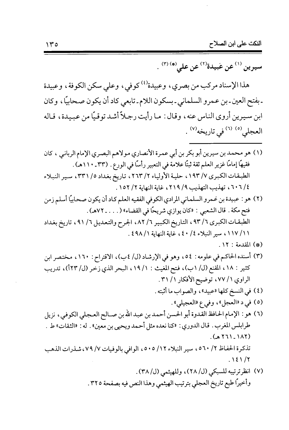 هَذَا الْإِسْنَاد مركب من بَصرِي وَعبيدَة كُوفِي وَعلي سكن الْكُوفَة وَعبيدَة - بِفَتْح الْعين - بن عَمْرو السَّلمَانِي - بِسُكُون اللَّام - تَابِعِيّ كَاد أَن يكون صحابيا وَكَانَ ابْن سِيرِين أروى النَّاس عَنهُ وَقَالَ مَا رَأَيْت رجلا أَشد توقيا من عُبَيْدَة قَالَه الْعجلِيّ فِي تَارِيخه