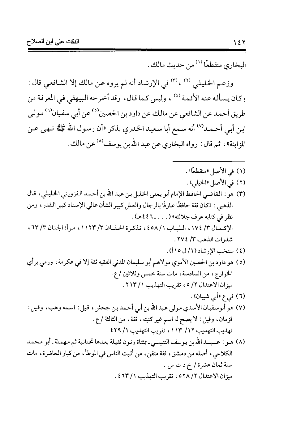 وَزعم الخليلي فِي الْإِرْشَاد أَنه لم يروه عَن مَالك إِلَّا الشَّافِعِي قَالَ وَكَانَ يسْأَله عَنهُ الْأَئِمَّة وَلَيْسَ كَمَا قَالَ وَقد أخرجه الْبَيْهَقِيّ فِي الْمعرفَة من طَرِيق أَحْمد عَن الشَّافِعِي عَن مَالك عَن دَاوُد بن الْحصين عَن أبي سُفْيَان مولى ابْن أبي أَحْمد أَنه سمع أَبَا سعيد الْخُدْرِيّ يذكر أَن رَسُول الله صلى الله عَلَيْهِ وَسلم نهى عَن الْمُزَابَنَة ثمَّ قَالَ رَوَاهُ البُخَارِيّ عَن عبد الله بن يُوسُف عَن مَالك