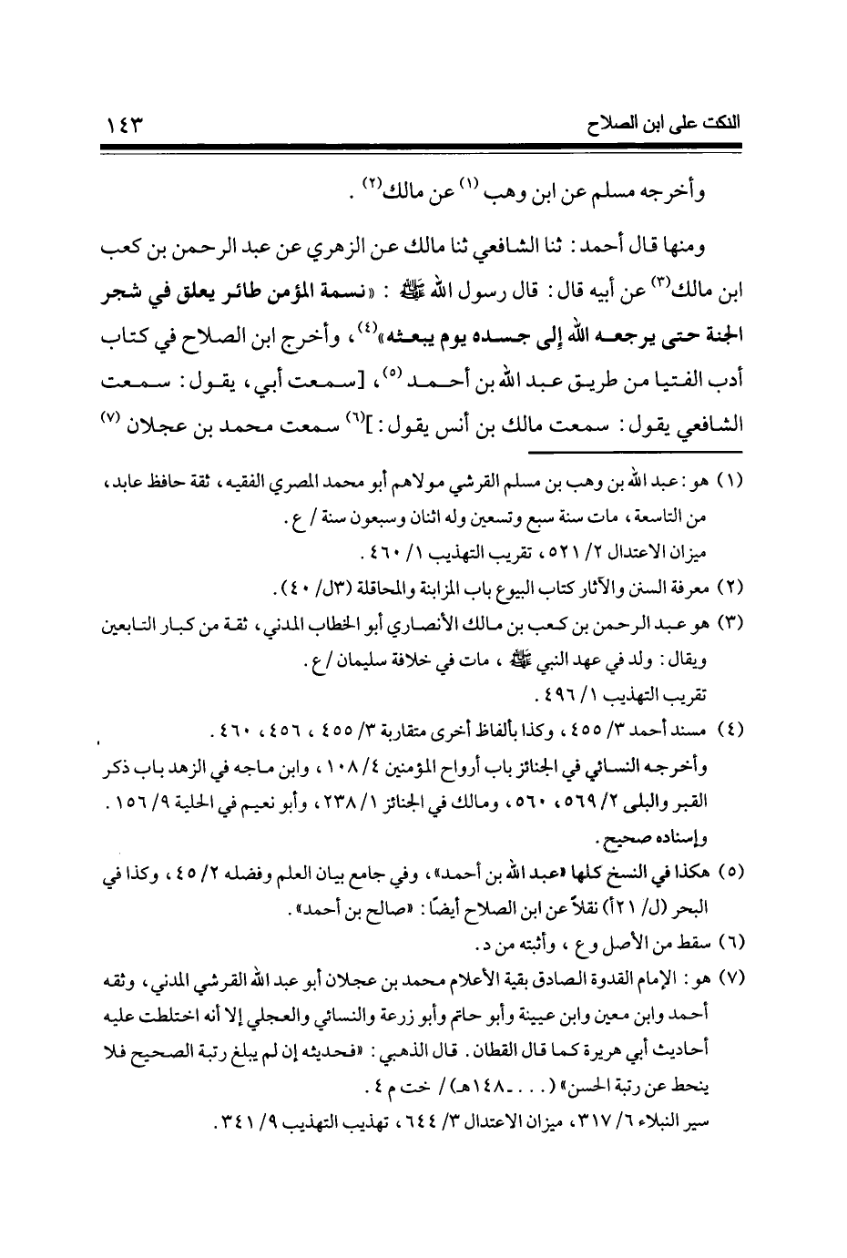 وَمِنْهَا قَالَ أَحْمد ثَنَا الشَّافِعِي ثَنَا مَالك عَن الزُّهْرِيّ عَن عبد الرَّحْمَن بن كَعْب ابْن مَالك عَن أَبِيه قَالَ قَالَ رَسُول الله صلى الله عَلَيْهِ وَسلم نسمَة الْمُؤمن طَائِر يعلق فِي شجر الْجنَّة حَتَّى يرجعه الله إِلَى جسده يَوْم يَبْعَثهُ وَأخرج ابْن الصّلاح فِي كتاب أدب الْفتيا من طَرِيق عبد الله بن أَحْمد [سَمِعت أبي يَقُول سَمِعت الشَّافِعِي يَقُول سَمِعت مَالك بن أنس يَقُول] سَمِعت مُحَمَّد بن عجلَان