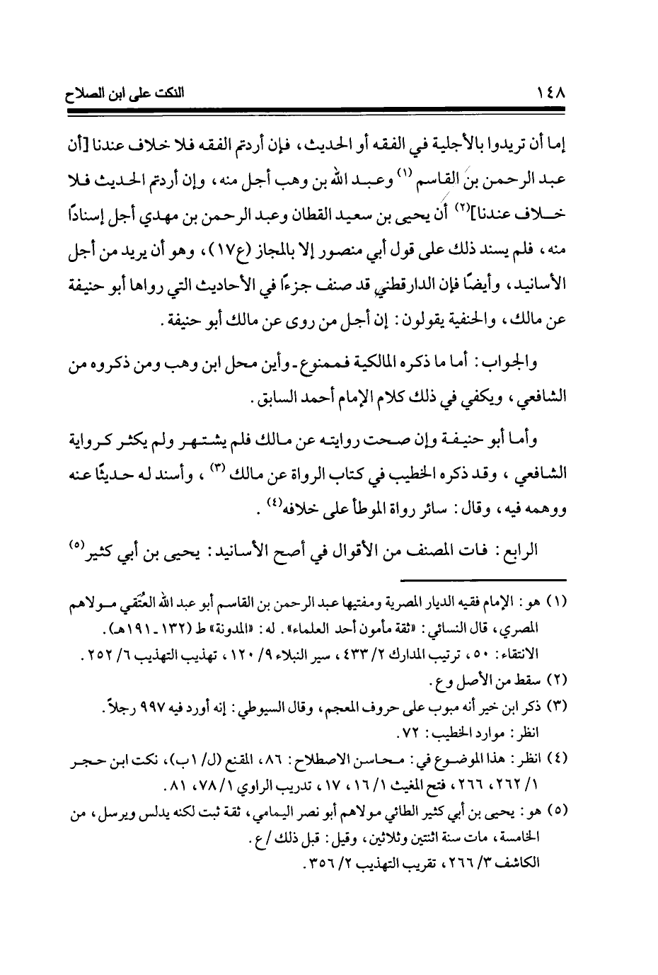 الرَّابِع فَاتَ المُصَنّف من الْأَقْوَال فِي أصح الْأَسَانِيد يحيى بن أبي كثير