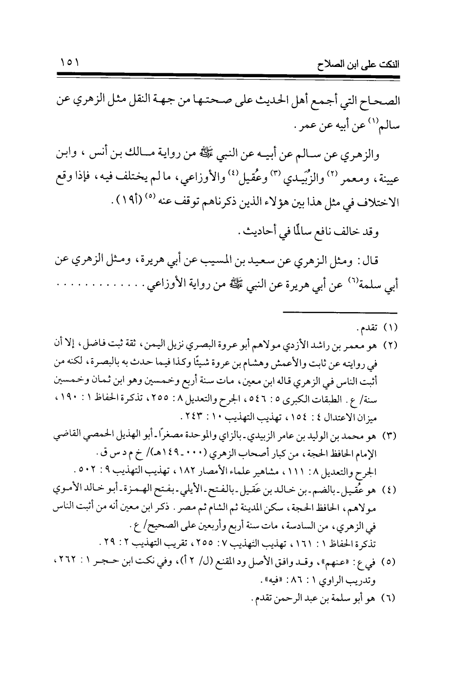 وَالزهْرِيّ عَن سَالم عَن أَبِيه عَن النَّبِي صلى الله عَلَيْهِ وَسلم من رِوَايَة مَالك بن أنس وَابْن عُيَيْنَة وَمعمر والزبيدي وَعقيل وَالْأَوْزَاعِيّ مالم يخْتَلف فِيهِ فَإِذا وَقع الِاخْتِلَاف فِي مثل هَذَا بَين هَؤُلَاءِ الَّذين ذَكَرْنَاهُمْ توقف عَنهُ (أ 19)