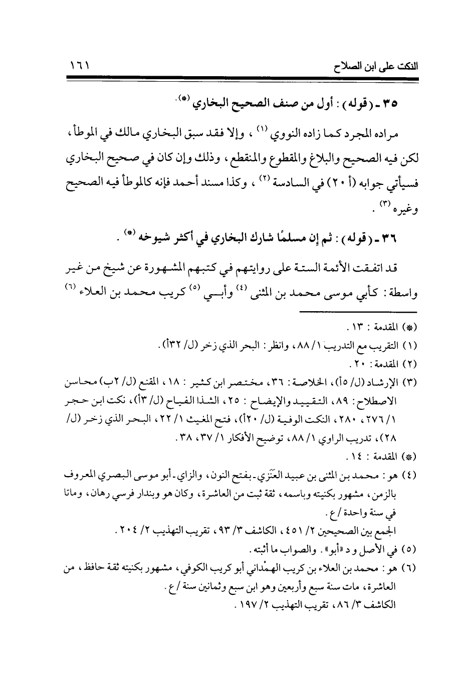 مُرَاده الْمُجَرّد كَمَا زَاده النَّوَوِيّ وَإِلَّا فقد سبق البُخَارِيّ مَالك فِي الْمُوَطَّأ لَكِن فِيهِ الصَّحِيح والبلاغ والمقطوع والمنقطع وَذَلِكَ وَإِن كَانَ فِي صَحِيح البُخَارِيّ فَسَيَأْتِي جَوَابه (أ 20) فِي السَّادِسَة وَكَذَا مُسْند أَحْمد فَإِنَّهُ كالموطأ فِيهِ الصَّحِيح وَغَيره