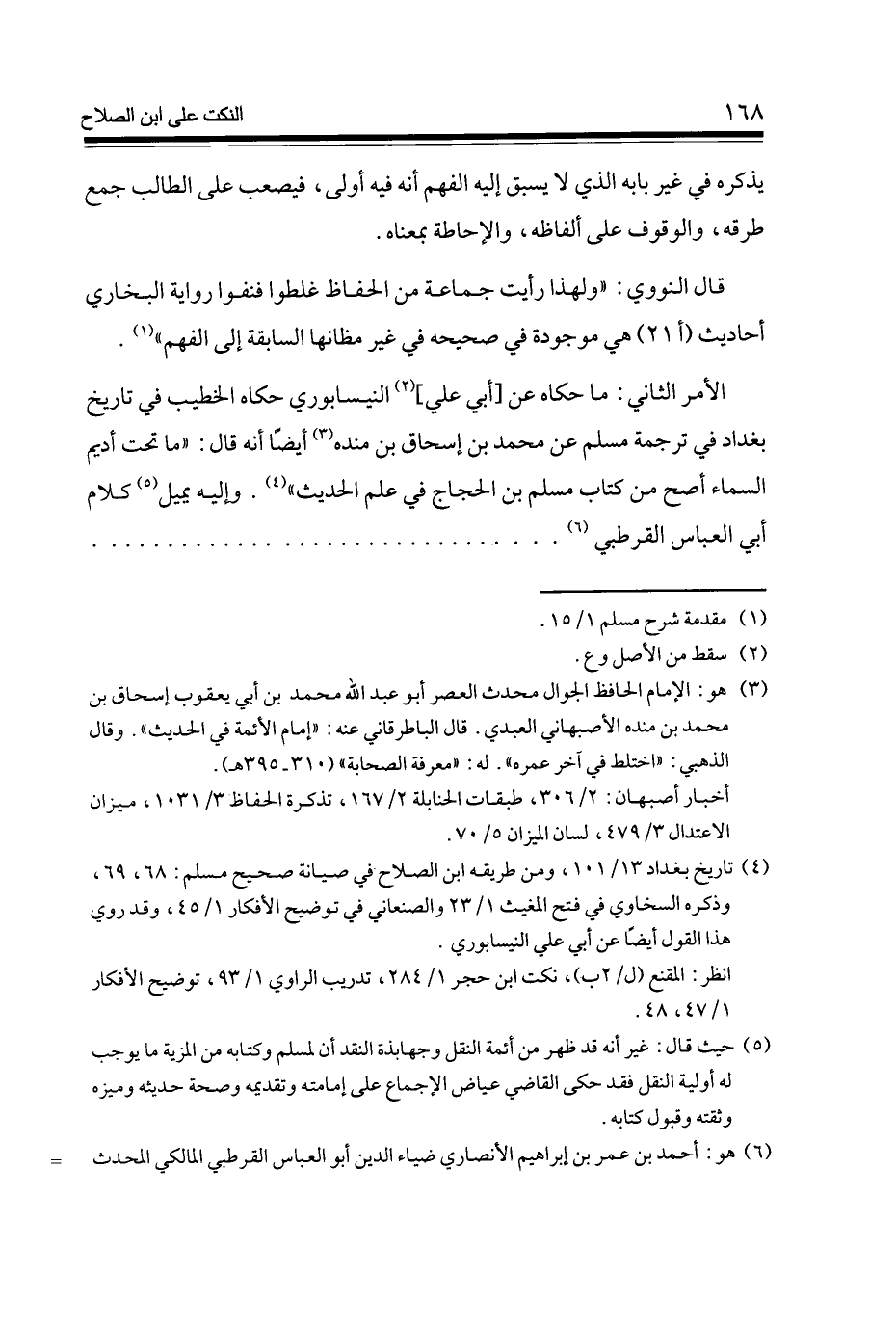 الْأَمر الثَّانِي مَا حَكَاهُ عَن [أبي عَليّ] النَّيْسَابُورِي حَكَاهُ الْخَطِيب فِي تَارِيخ بَغْدَاد فِي تَرْجَمَة مُسلم عَن مُحَمَّد بن إِسْحَاق بن مَنْدَه أَيْضا أَنه قَالَ مَا تَحت أَدِيم السَّمَاء أصح من كتاب مُسلم بن الْحجَّاج فِي علم الحَدِيث وَإِلَيْهِ يمِيل كَلَام أبي الْعَبَّاس الْقُرْطُبِيّ