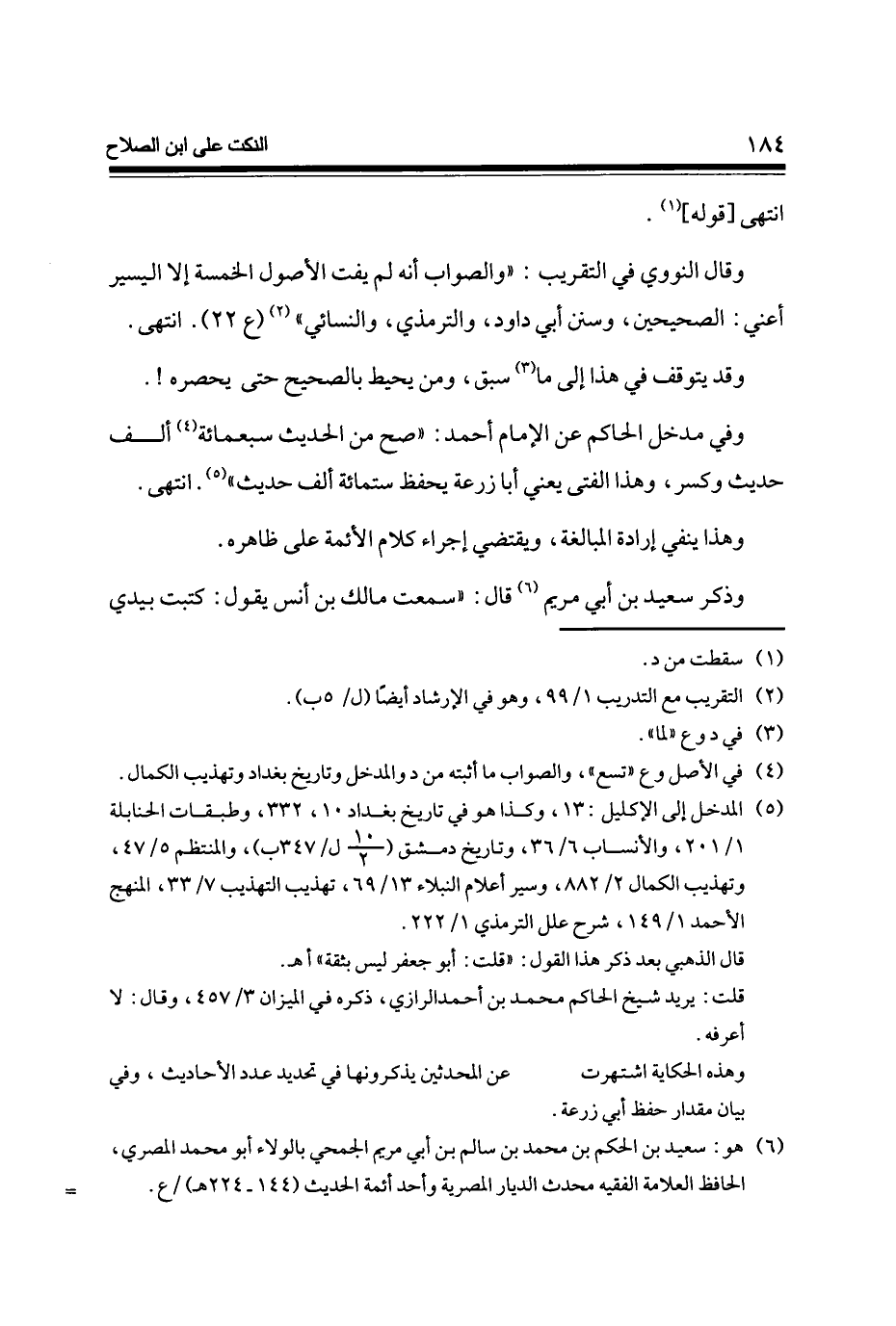 وَقَالَ النَّوَوِيّ فِي التَّقْرِيب وَالصَّوَاب أَنه لم يفت الْأُصُول الْخَمْسَة إِلَّا الْيَسِير أَعنِي الصَّحِيحَيْنِ وَسنَن أبي دَاوُد وَالتِّرْمِذِيّ وَالنَّسَائِيّ (ع 22) انْتهى
