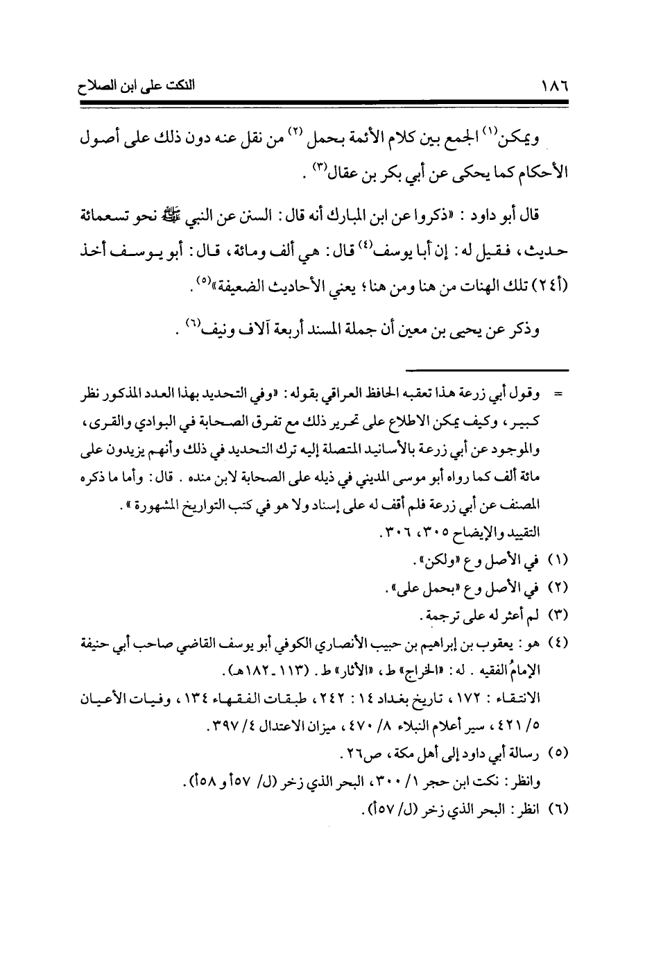 قَالَ أَبُو دَاوُد ذكرُوا عَن ابْن الْمُبَارك أَنه قَالَ السّنَن عَن النَّبِي صلى الله عَلَيْهِ وَسلم نَحْو تِسْعمائَة حَدِيث فَقيل لَهُ إِن أَبَا يُوسُف قَالَ هِيَ ألف وَمِائَة قَالَ أَبُو يُوسُف أَخذ (أ 24) تِلْكَ الهنات من هُنَا وَمن هُنَا يَعْنِي الْأَحَادِيث الضعيفة