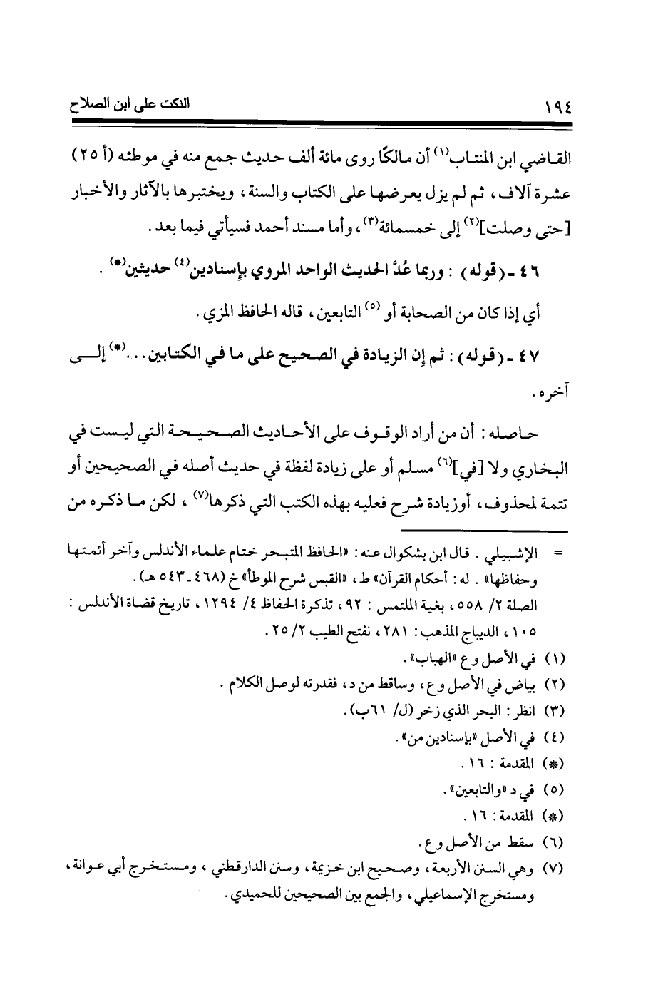 46 - (قَوْله) وَرُبمَا عد الحَدِيث الْوَاحِد الْمَرْوِيّ بِإِسْنَادَيْنِ حديثين أَي إِذا كَانَ من الصَّحَابَة أَو التَّابِعين قَالَه الْحَافِظ الْمزي