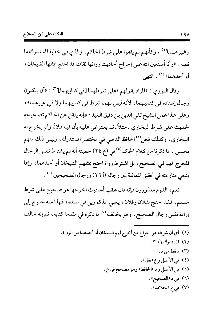 وَقَالَ النَّوَوِيّ المُرَاد بقَوْلهمْ على شَرطهمَا [فِي كِتَابَيْهِمَا] أَن يكون رجال إِسْنَاده فِي كِتَابَيْهِمَا لِأَنَّهُ لَيْسَ لَهما شَرط فِي كِتَابَيْهِمَا وَلَا فِي غَيرهمَا وعَلى هَذَا عمل الشَّيْخ تَقِيّ الدّين بن دَقِيق الْعِيد فَإِنَّهُ ينْقل عَن الْحَاكِم تَصْحِيحه لحَدِيث على شَرط البُخَارِيّ - مثلا - ثمَّ يعْتَرض عَلَيْهِ بِأَن فِيهِ فلَانا وَلم يخرج لَهُ البُخَارِيّ وَكَذَلِكَ فعل الْحَافِظ الذَّهَبِيّ فِي مُخْتَصر الْمُسْتَدْرك وَلَيْسَ ذَلِك مِنْهُم بِحسن لما ذكرنَا من كَلَام الْحَاكِم فِي (ع 24) خطبَته أَنه لم يشْتَرط نفس الرِّجَال الْمخْرج لَهُم فِي الصَّحِيح بل اشْترط رُوَاة احْتج بمثلهم الشَّيْخَانِ أَو أَحدهمَا وَإِنَّمَا يَنْبَغِي منازعته فِي تَحْقِيق الْمُمَاثلَة بَين رِجَاله (أ 26) وَرِجَال الصَّحِيحَيْنِ