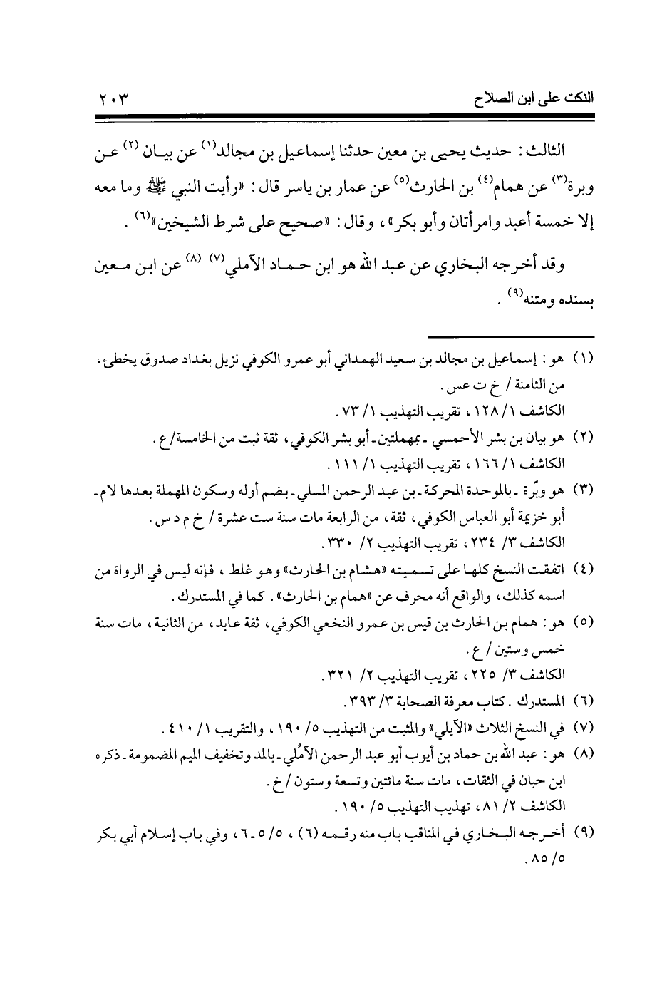 الثَّالِث حَدِيث يحيى بن معِين حَدثنَا إِسْمَاعِيل بن مجَالد عَن بَيَان عَن وبرة عَن همام بن الْحَارِث عَن عمار بن يَاسر قَالَ رَأَيْت النَّبِي صلى الله عَلَيْهِ وَسلم وَمَا مَعَه إِلَّا خَمْسَة أعبد وَامْرَأَتَانِ وَأَبُو بكر وَقَالَ صَحِيح على شَرط الشَّيْخَيْنِ