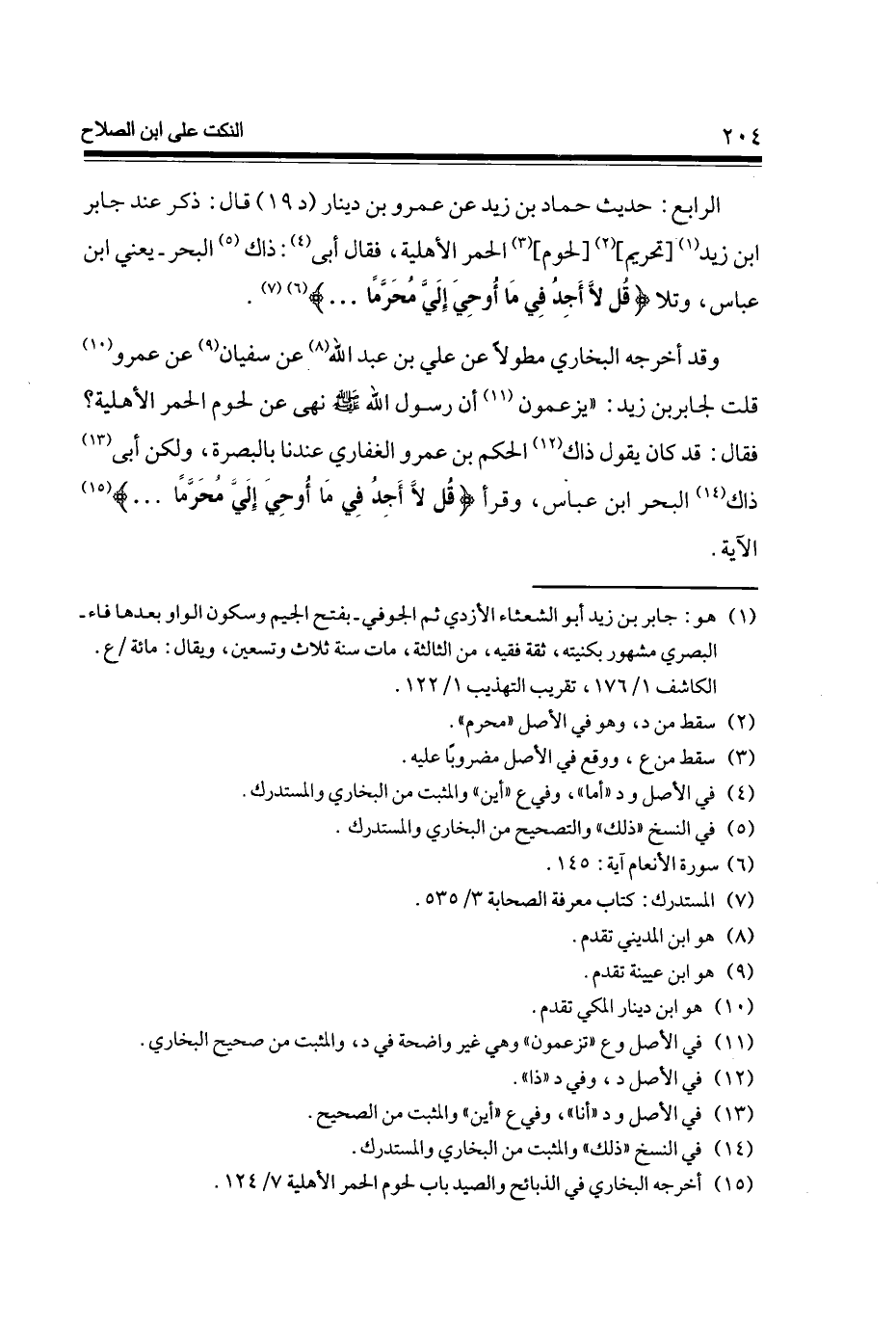 الرَّابِع حَدِيث حَمَّاد بن زيد عَن عَمْرو بن دِينَار (د 19) قَالَ ذكر عِنْد جَابر ابْن زيد [تَحْرِيم] [لُحُوم] الْحمر الْأَهْلِيَّة فَقَالَ أَبى ذَاك الْبَحْر - يَعْنِي ابْن عَبَّاس وتلا {قل لَا أجد فِيمَا أُوحِي إِلَيّ محرما}