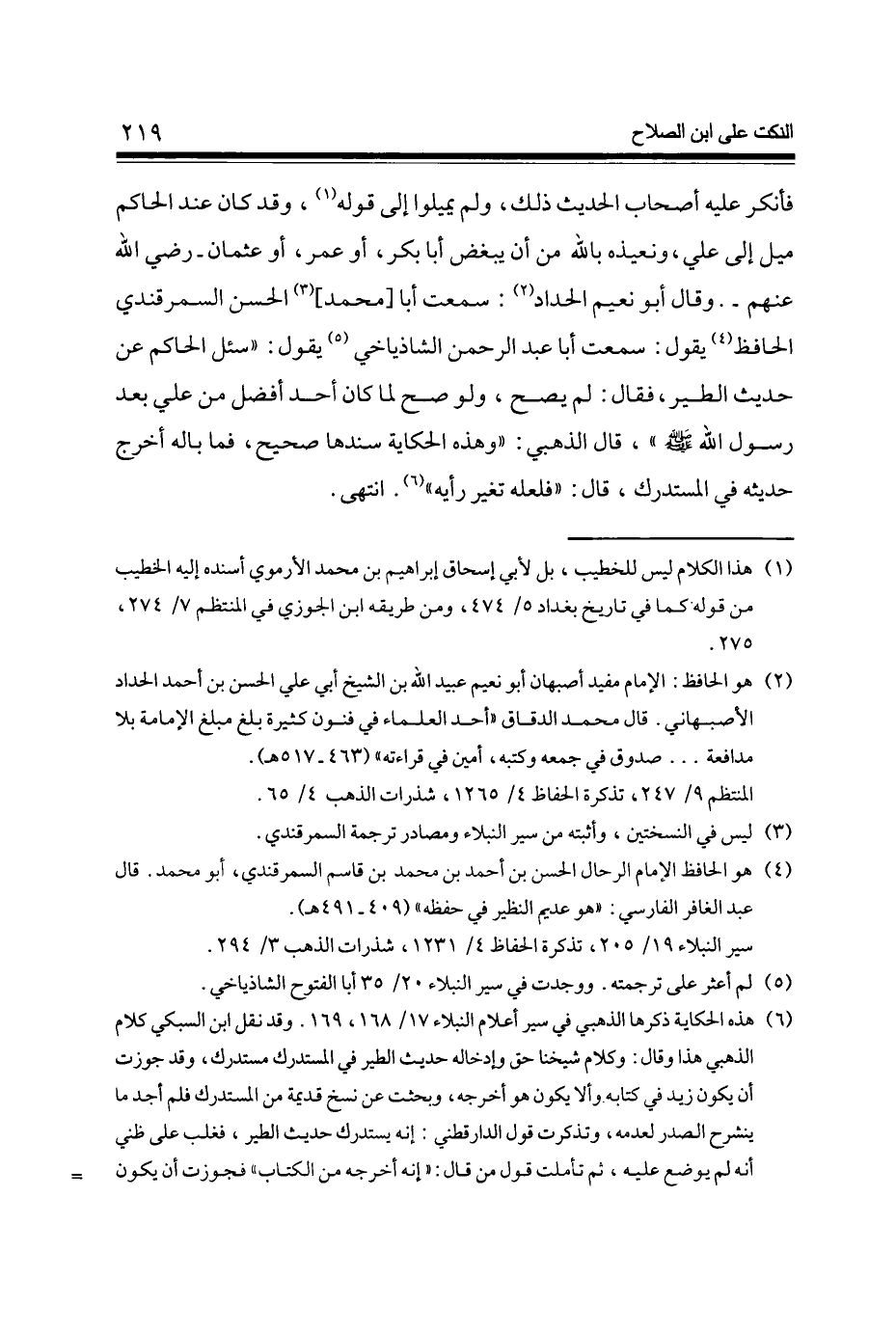 فَأنْكر عَلَيْهِ أَصْحَاب الحَدِيث ذَلِك وَلم يميلوا إِلَى قَوْله وَقد كَانَ عِنْد الْحَاكِم ميل إِلَى عَليّ ونعيذه بِاللَّه من أَن يبغض أَبَا بكر أَو عمر أَو عُثْمَان - رَضِي الله عَنْهُم - وَقَالَ أَبُو نعيم الْحداد سَمِعت أَبَا [مُحَمَّد] الْحسن السَّمرقَنْدِي الْحَافِظ يَقُول سَمِعت أَبَا عبد الرَّحْمَن الشاذياخي يَقُول سُئِلَ الْحَاكِم عَن حَدِيث الطير فَقَالَ لم يَصح وَلَو صَحَّ لما كَانَ أحد أفضل من عَليّ بعد رَسُول الله صلى الله عَلَيْهِ وَسلم قَالَ الذَّهَبِيّ وَهَذِه الْحِكَايَة سندها صَحِيح فَمَا باله أخرج حَدِيثه فِي الْمُسْتَدْرك قَالَ فَلَعَلَّهُ تغير رَأْيه انْتهى