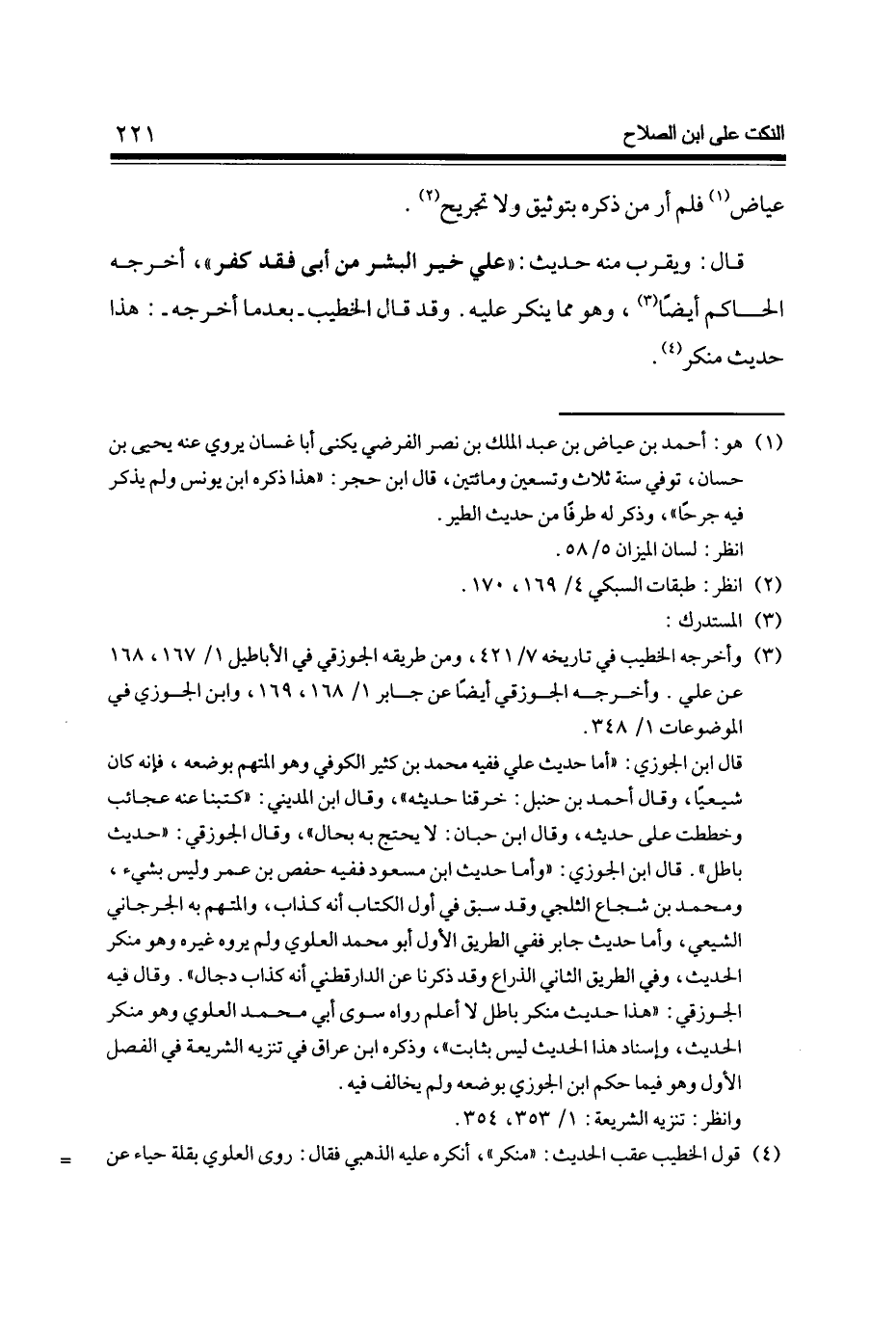 قَالَ وَيقرب مِنْهُ حَدِيث عَليّ خير الْبشر من أبي فقد كفر أخرجه الْحَاكِم أَيْضا وَهُوَ مِمَّا يُنكر عَلَيْهِ وَقد قَالَ الْخَطِيب - بَعْدَمَا أخرجه - هَذَا حَدِيث مُنكر