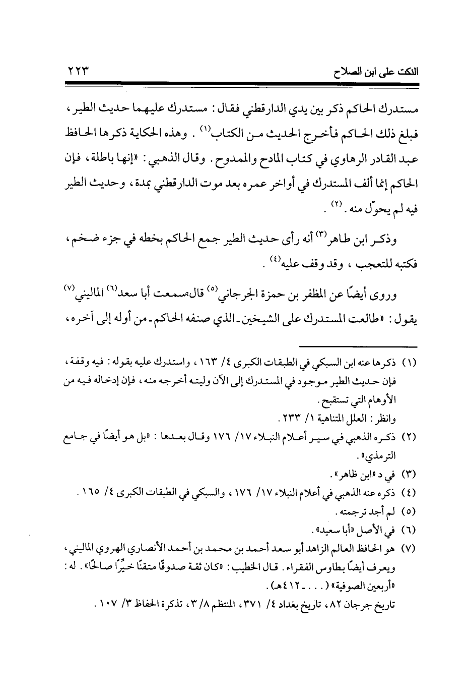 وروى أَيْضا عَن المظفر بن حَمْزَة الْجِرْجَانِيّ قَالَ سَمِعت أَبَا سعد الْمَالِينِي يَقُول طالعت الْمُسْتَدْرك على الشَّيْخَيْنِ - الَّذِي صنفه الْحَاكِم - من أَوله إِلَى آخِره