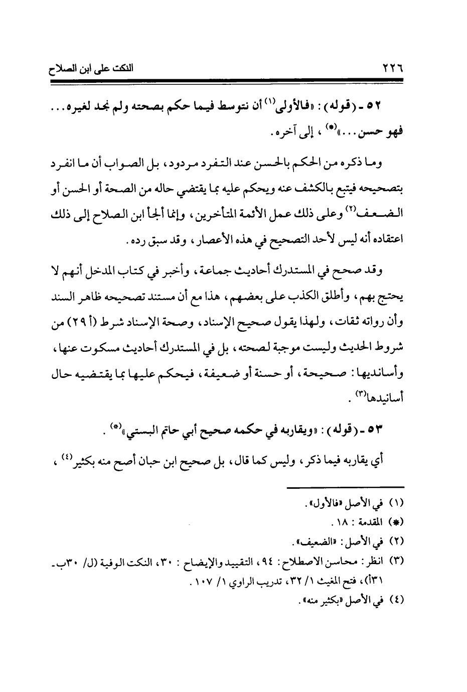 وَمَا ذكره من الحكم بالْحسنِ عِنْد التفرد مَرْدُود بل الصَّوَاب أَن مَا انْفَرد بِتَصْحِيحِهِ فَيتبع بالكشف عَنهُ وَيحكم عَلَيْهِ بِمَا يَقْتَضِي حَاله من الصِّحَّة أَو الْحسن أَو الضعْف وعَلى ذَلِك عمل الْأَئِمَّة الْمُتَأَخِّرين وَإِنَّمَا ألجأ ابْن الصّلاح إِلَى ذَلِك اعْتِقَاده أَنه لَيْسَ لأحد التَّصْحِيح فِي هَذِه الْأَعْصَار وَقد سبق رده