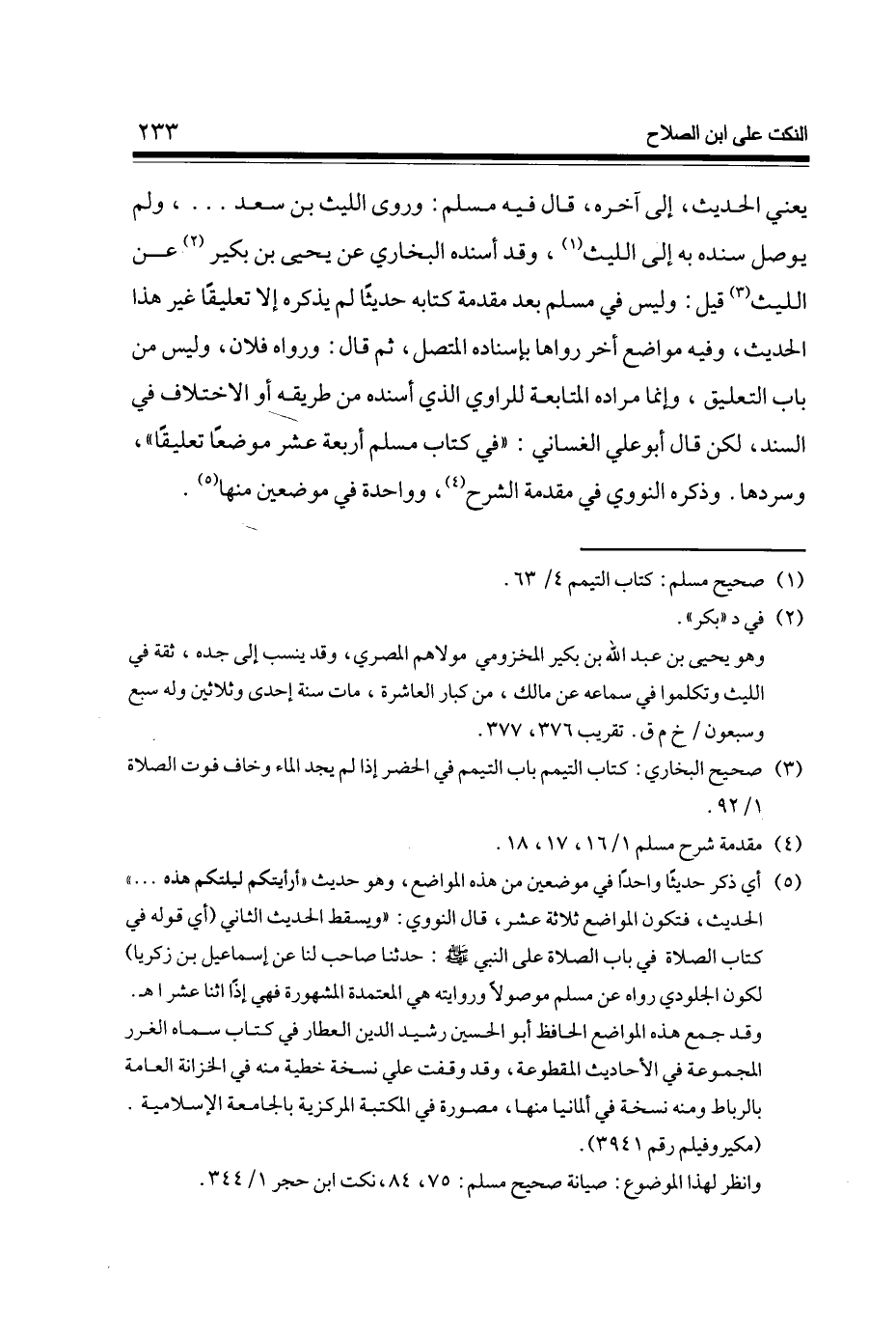 يَعْنِي الحَدِيث إِلَى آخِره قَالَ فِيهِ مُسلم وروى اللَّيْث بن سعد وَلم يُوصل سَنَده بِهِ إِلَى اللَّيْث وَقد أسْندهُ البُخَارِيّ عَن يحيى بن بكير عَن اللَّيْث قيل وَلَيْسَ فِي مُسلم بعد مُقَدّمَة كِتَابه حَدِيثا لم يذكرهُ إِلَّا تَعْلِيقا غير هَذَا الحَدِيث وَفِيه مَوَاضِع أخر رَوَاهَا بِإِسْنَادِهِ الْمُتَّصِل ثمَّ قَالَ وَرَوَاهُ فلَان وَلَيْسَ من بَاب التَّعْلِيق وَإِنَّمَا مُرَاده الْمُتَابَعَة للراوي الَّذِي أسْندهُ من طَرِيقه أَو الِاخْتِلَاف فِي السَّنَد لَكِن قَالَ أَبُو عَليّ الغساني فِي كتاب مُسلم أَرْبَعَة عشر موضعا تَعْلِيقا وسردها وَذكره النَّوَوِيّ فِي مُقَدّمَة الشَّرْح وَوَاحِدَة فِي موضِعين مِنْهَا