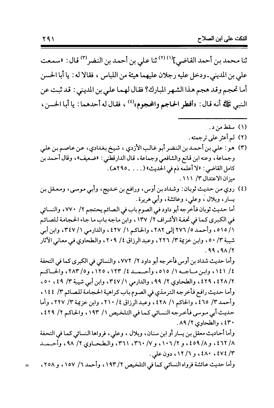 ثَنَا مُحَمَّد بن أَحْمد القَاضِي] ثَنَا عَليّ بن أَحْمد بن النَّضر قَالَ سَمِعت عَليّ بن الْمَدِينِيّ - وَدخل عَلَيْهِ رجلَانِ عَلَيْهِمَا هَيْئَة من اللبَاس فَقَالَا لَهُ يَا أَبَا الْحسن أما تحجم وَقد هجم هَذَا الشَّهْر الْمُبَارك فَقَالَ لَهما عَليّ بن الْمَدِينِيّ قد ثَبت عَن النَّبِي صلى الله عَلَيْهِ وَسلم أَنه قَالَ أفطر الحاجم والمحجوم فَقَالَ لَهُ أَحدهمَا يَا أَبَا الْحسن