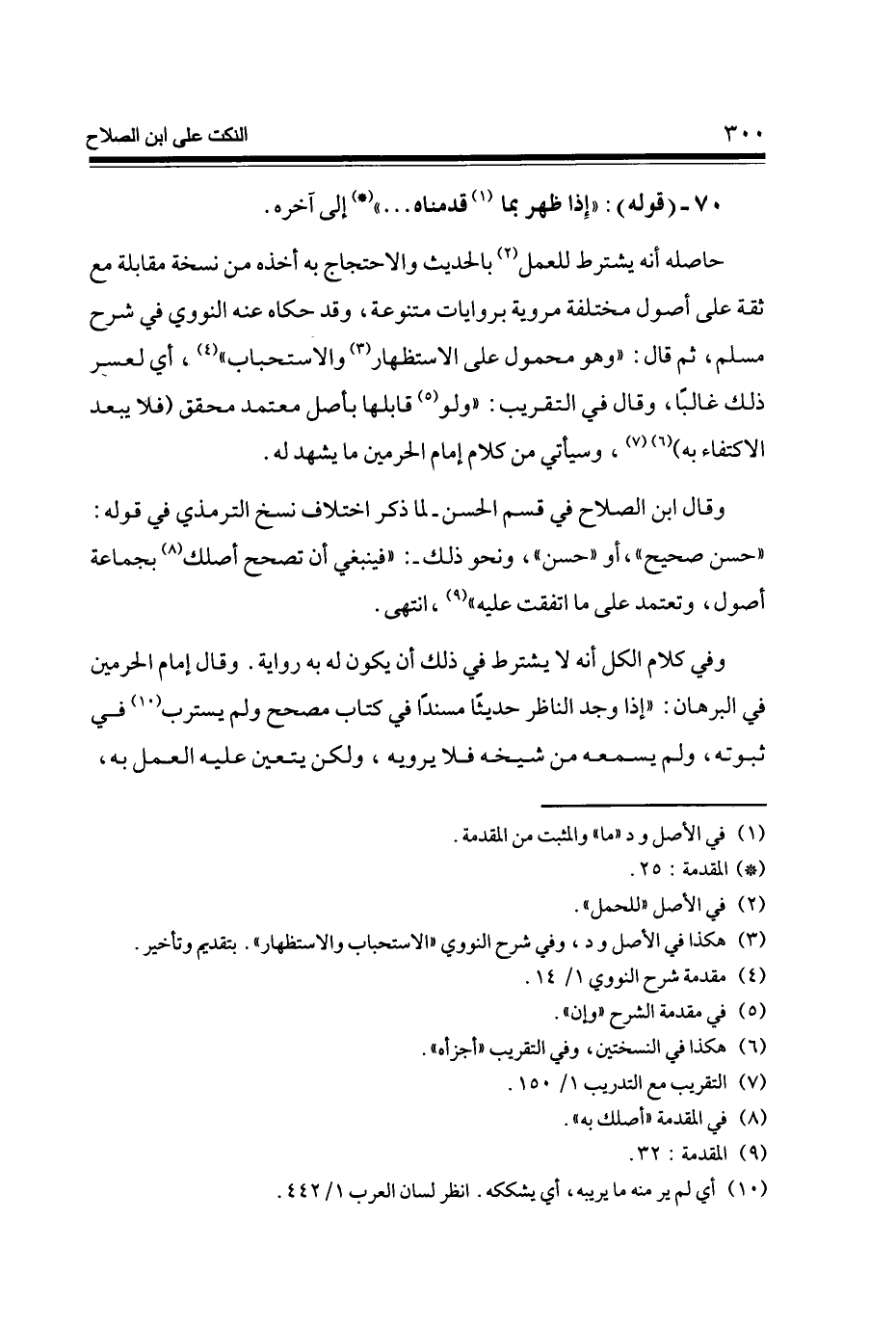 وَقَالَ ابْن الصّلاح فِي قسم الْحسن - لما ذكر اخْتِلَاف نسخ التِّرْمِذِيّ فِي قَوْله حسن صَحِيح أَو حسن وَنَحْو ذَلِك - فَيَنْبَغِي أَن تصحح أصلك بِجَمَاعَة أصُول وتعتمد على مَا اتّفقت عَلَيْهِ انْتهى