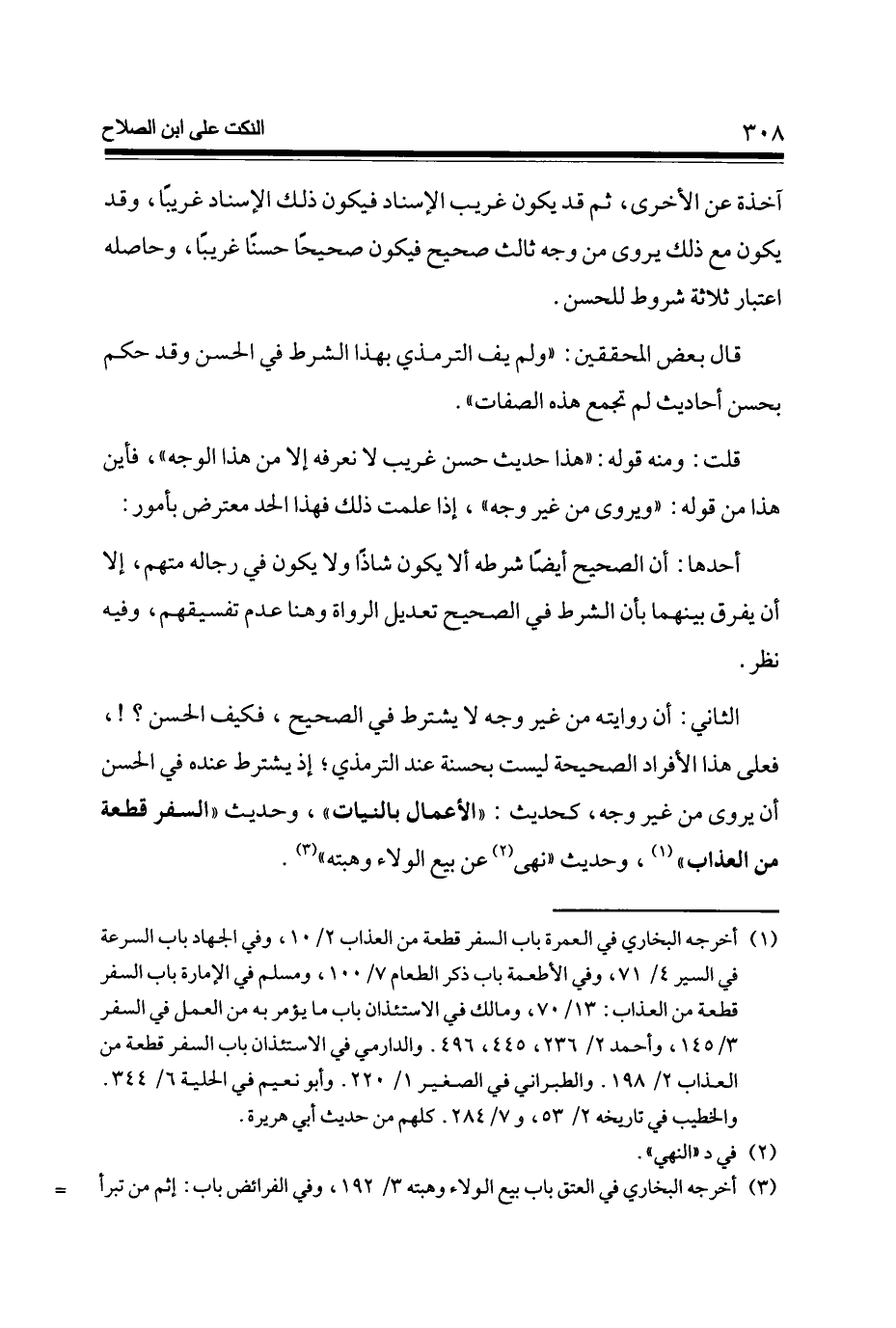 الثَّانِي أَن رِوَايَته من غير وَجه لَا يشْتَرط فِي الصَّحِيح فَكيف الْحسن فعلى هَذَا الْأَفْرَاد الصَّحِيحَة لَيست بحسنة عِنْد التِّرْمِذِيّ إِذْ يشْتَرط عِنْده فِي الْحسن أَن يرْوى من غير وَجه كَحَدِيث الْأَعْمَال بِالنِّيَّاتِ وَحَدِيث السّفر قِطْعَة من الْعَذَاب وَحَدِيث نهى عَن بيع الْوَلَاء وهبته