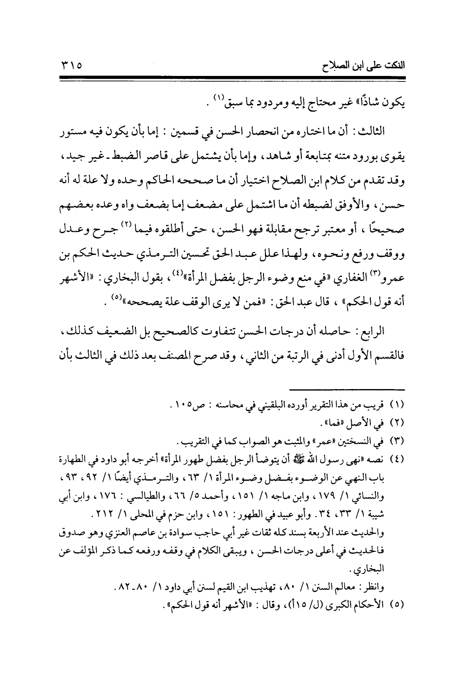الثَّالِث أَن مَا اخْتَارَهُ من انحصار الْحسن فِي قسمَيْنِ إِمَّا بِأَن يكون فِيهِ مَسْتُور يقوى بورود مَتنه بمتابعة أَو شَاهد وَإِمَّا بِأَن يشْتَمل على قَاصِر الضَّبْط - غير جيد وَقد تقدم من كَلَام ابْن الصّلاح اخْتِيَار أَن مَا صَححهُ الْحَاكِم وَحده وَلَا عِلّة لَهُ أَنه حسن والأوفق لضبطه أَن مَا اشْتَمَل على مضعف إِمَّا بِضعْف واه وعده بَعضهم صَحِيحا أَو مُعْتَبر ترجح مُقَابلَة فَهُوَ الْحسن حَتَّى أَطْلقُوهُ فِيمَا جرح وَعدل ووقف وَرفع وَنَحْوه وَلِهَذَا علل عبد الْحق تَحْسِين التِّرْمِذِيّ حَدِيث الحكم بن عَمْرو الْغِفَارِيّ فِي منع وضوء الرجل بِفضل الْمَرْأَة بقول البُخَارِيّ الْأَشْهر أَنه قَول الحكم قَالَ عبد الْحق فَمن لَا يرى الْوَقْف عِلّة يُصَحِّحهُ