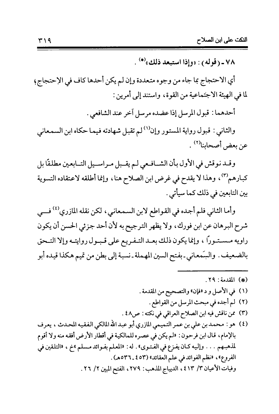 وَقد نُوقِشَ فِي الأول بِأَن الشَّافِعِي لم يقبل مَرَاسِيل التَّابِعين مُطلقًا بل كبارهم وَهَذَا لَا يقْدَح فِي غَرَض ابْن الصّلاح هُنَا وَإِنَّمَا أطلقهُ لَا عتقاده التَّسْوِيَة بَين التَّابِعين فِي ذَلِك كَمَا سَيَأْتِي