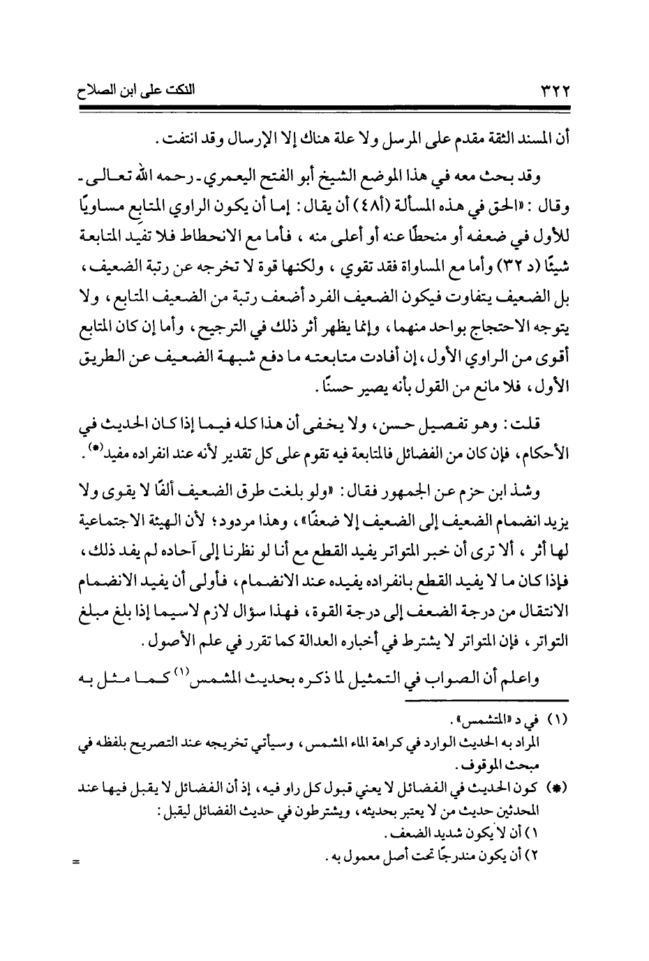 وَقد بحث مَعَه فِي هَذَا الْموضع الشَّيْخ أَبُو الْفَتْح الْيَعْمرِي - رَحمَه الله تَعَالَى - وَقَالَ الْحق فِي هَذِه الْمَسْأَلَة (أ 48) أَن يُقَال إِمَّا أَن يكون الرَّاوِي المتابع مُسَاوِيا للْأولِ فِي ضعفه أَو منحطا عَنهُ أَو أَعلَى مِنْهُ فَأَما مَعَ الانحطاط فَلَا تفِيد الْمُتَابَعَة شَيْئا (د 32) وَأما مَعَ الْمُسَاوَاة فقد