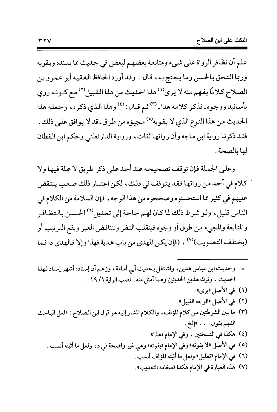 علم أَن تظافر الروَاة على شَيْء ومتابعة بَعضهم لبَعض فِي حَدِيث مِمَّا يسْندهُ ويقويه وَرُبمَا الْتحق بالْحسنِ وَمَا يحْتَج بِهِ قَالَ وَقد أورد الْحَافِظ الْفَقِيه أَبُو عَمْرو بن الصّلاح كلَاما يفهم مِنْهُ لَا يرى هَذَا الحَدِيث من هَذَا الْقَبِيل مَعَ كَونه رُوِيَ بأسانيد ووجوه - فَذكر كَلَامه هَذَا - ثمَّ قَالَ وَهَذَا الَّذِي ذكره وَجعله هَذَا الحَدِيث من هَذَا النَّوْع الَّذِي لَا يقويه مجيؤه من طرق - قد لَا يُوَافق على ذَلِك فقد ذكرنَا رِوَايَة ابْن مَاجَه وَأَن رواتها ثِقَات وَرِوَايَة الدَّارَقُطْنِيّ وَحكم ابْن الْقطَّان لَهَا بِالصِّحَّةِ