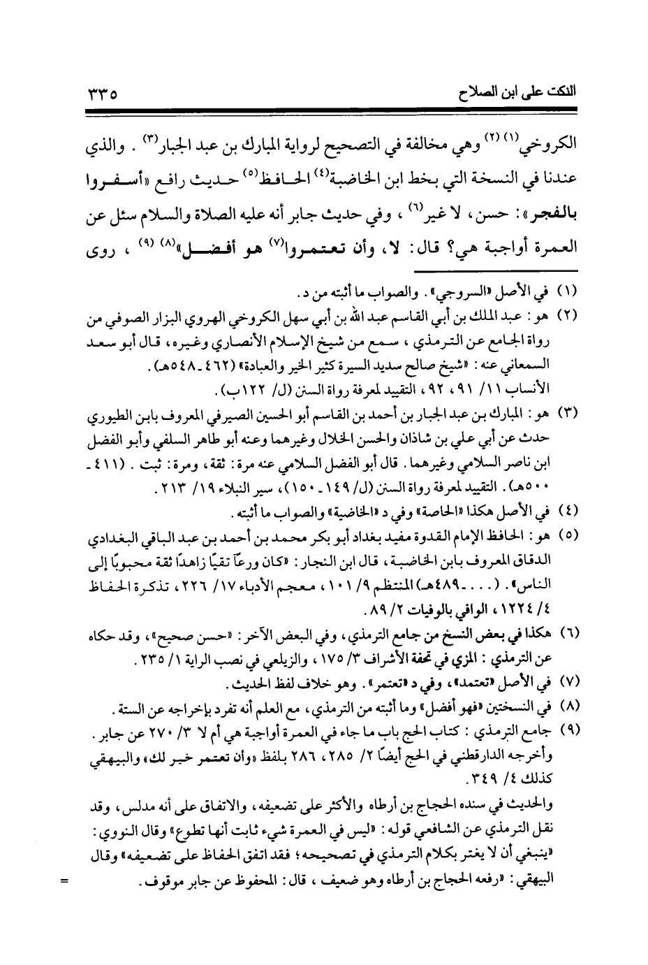 الكروخي وَهِي مُخَالفَة فِي التَّصْحِيح لرِوَايَة الْمُبَارك بن عبد الْجَبَّار وَالَّذِي عندنَا فِي النُّسْخَة الَّتِي بِخَط ابْن الخاضبة الْحَافِظ حَدِيث رَافع أسفروا بِالْفَجْرِ حسن لَا غير وَفِي حَدِيث جَابر أَنه عَلَيْهِ الصَّلَاة وَالسَّلَام سُئِلَ عَن الْعمرَة أَوَاجِبَة هِيَ قَالَ لَا وَأَن تَعْتَمِرُوا هُوَ أفضل روى