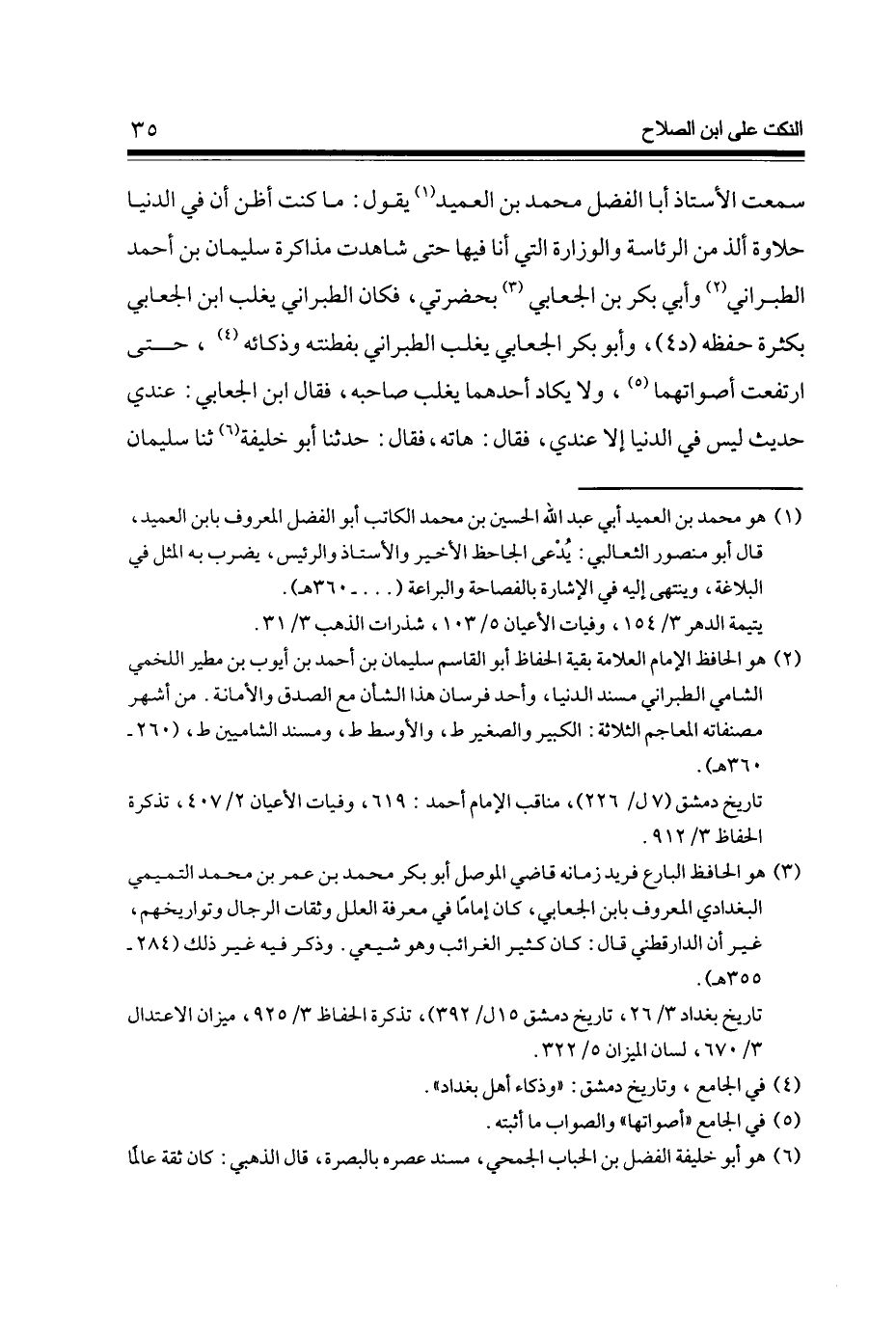 سَمِعت الْأُسْتَاذ أَبَا الْفضل مُحَمَّد بن العميد يَقُول مَا كنت أَظن أَن فِي الدُّنْيَا حلاوة ألذ من الرِّئَاسَة والوزارة الَّتِي أَنا فِيهَا حَتَّى شاهدت مذاكرة سُلَيْمَان بن أَحْمد الطَّبَرَانِيّ وَأبي بكر بن الجعابي بحضرتي فَكَانَ الطَّبَرَانِيّ يغلب ابْن الجعابي بِكَثْرَة حفظه (د 4) وَأَبُو بكر الجعابي يغلب الطَّبَرَانِيّ بفطنته وذكائه حَتَّى ارْتَفَعت أصواتهما وَلَا يكَاد أَحدهمَا يغلب صَاحبه فَقَالَ ابْن الجعابي عِنْدِي حَدِيث لَيْسَ فِي الدُّنْيَا إِلَّا عِنْدِي فَقَالَ هاته فَقَالَ حَدثنَا أَبُو خَليفَة ثَنَا سُلَيْمَان