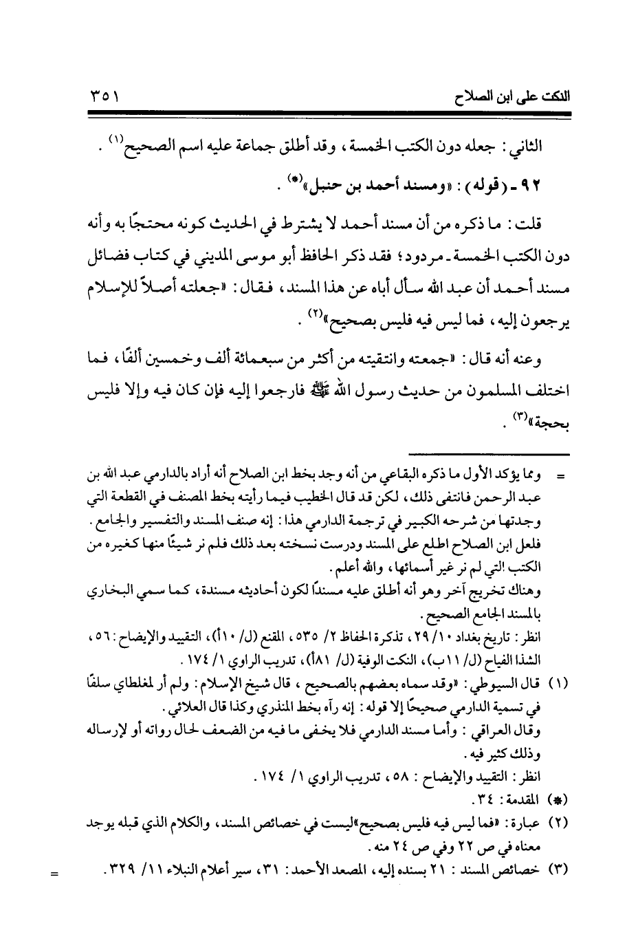 قلت مَا ذكره من أَن مُسْند أَحْمد لَا يشْتَرط فِي الحَدِيث كَونه محتجا بِهِ وَأَنه دون الْكتب الْخَمْسَة - مَرْدُود فقد ذكر الْحَافِظ أَبُو مُوسَى الْمَدِينِيّ فِي كتاب فَضَائِل مُسْند أَحْمد أَن عبد الله سَأَلَ أَبَاهُ عَن هَذَا الْمسند فَقَالَ جعلته أصلا لِلْإِسْلَامِ يرجعُونَ إِلَيْهِ فَمَا لَيْسَ فِيهِ فَلَيْسَ بِصَحِيح