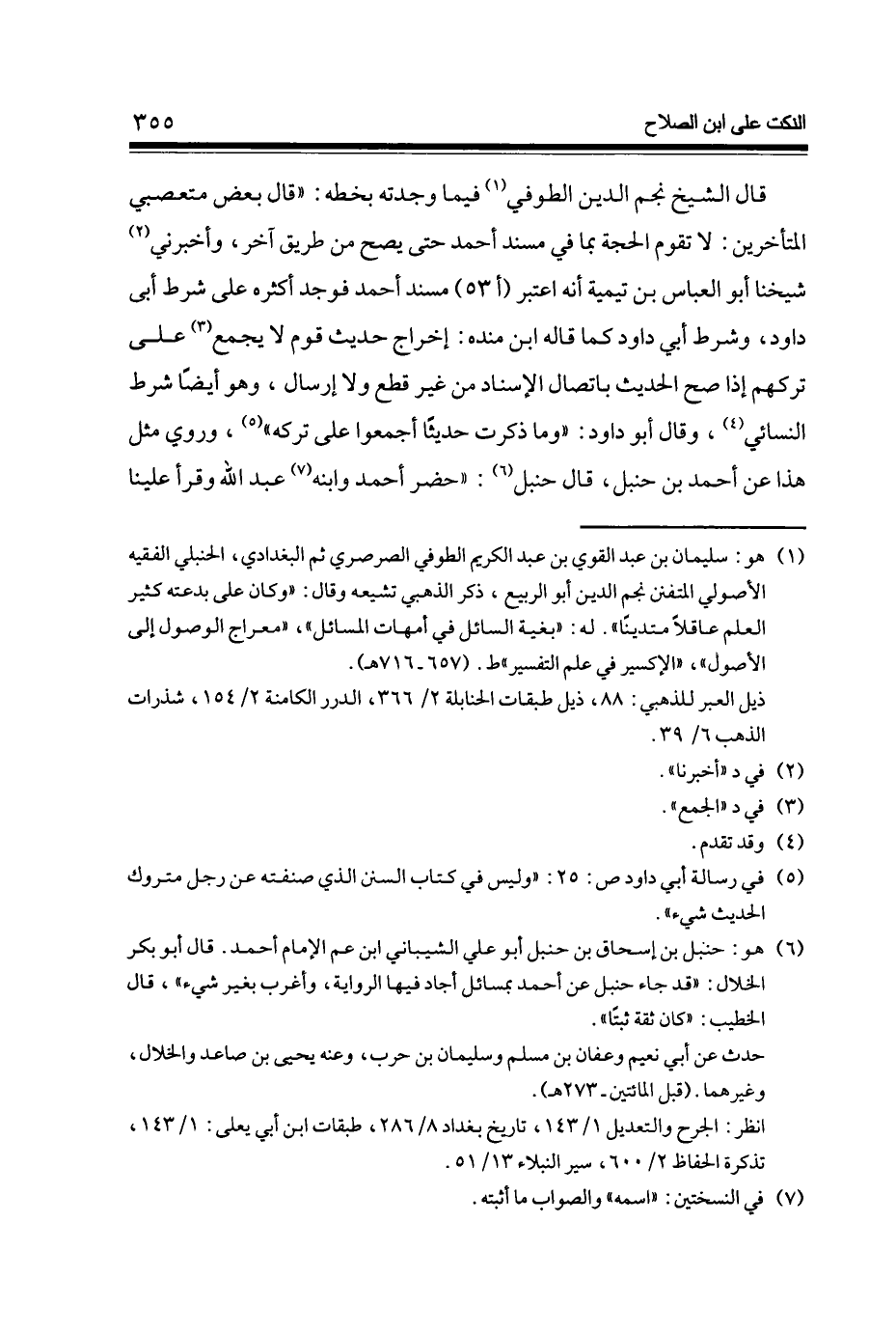 قَالَ الشَّيْخ نجم الدّين الطوفي فِيمَا وجدته بِخَطِّهِ قَالَ بعض متعصبي الْمُتَأَخِّرين لَا تقوم الْحجَّة بِمَا فِي مُسْند أَحْمد حَتَّى يَصح من طَرِيق آخر وَأَخْبرنِي شَيخنَا أَبُو الْعَبَّاس بن تَيْمِية أَنه اعْتبر (أ 53) مُسْند أَحْمد فَوجدَ أَكْثَره على شَرط أبي دَاوُد وَشرط أبي دَاوُد كَمَا قَالَه ابْن مَنْدَه إِخْرَاج حَدِيث قوم لَا يجمع على تَركهم إِذا صَحَّ الحَدِيث باتصال الْإِسْنَاد من غير قطع وَلَا إرْسَال وَهُوَ أَيْضا شَرط النَّسَائِيّ وَقَالَ أَبُو دَاوُد وَمَا ذكرت حَدِيثا أَجمعُوا على تَركه وَرُوِيَ مثل هَذَا عَن أَحْمد بن حَنْبَل قَالَ حَنْبَل حضر أَحْمد وَابْنه عبد الله وَقَرَأَ علينا