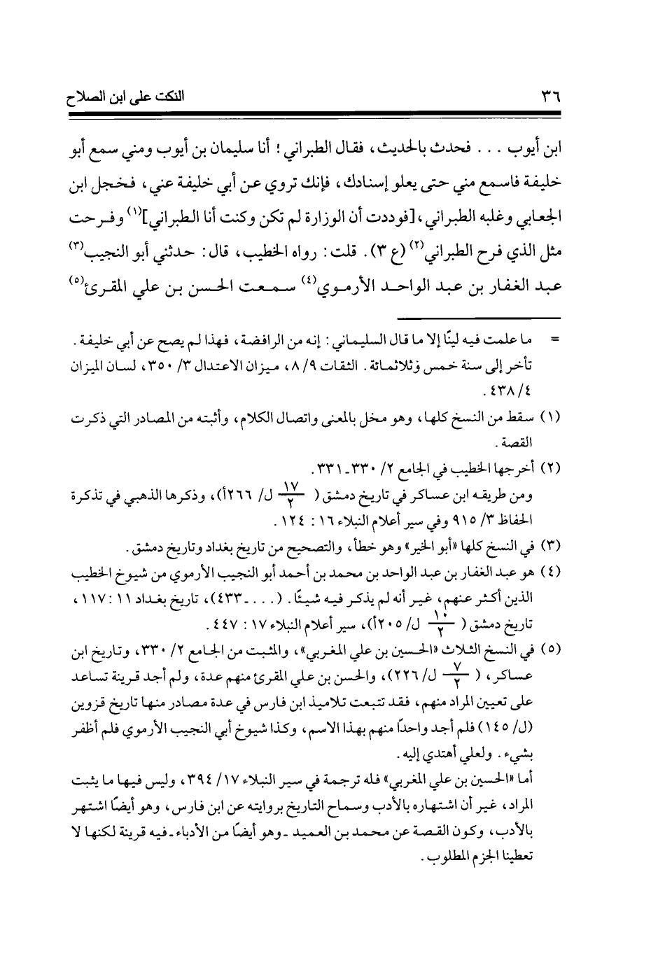 ابْن أَيُّوب فَحدث بِالْحَدِيثِ فَقَالَ الطَّبَرَانِيّ أَنا سُلَيْمَان بن أَيُّوب ومني سمع أَبُو خَليفَة فاسمع مني حَتَّى يَعْلُو إسنادك فَإنَّك تروي عَن أبي خَليفَة عني فَخَجِلَ ابْن الجعابي وغلبه الطَّبَرَانِيّ [فوددت أَن الوزارة لم تكن وَكنت أَنا الطَّبَرَانِيّ] وفرحت مثل الَّذِي فَرح الطَّبَرَانِيّ (ع 3) قلت رَوَاهُ الْخَطِيب قَالَ حَدثنِي أَبُو النجيب عبد الْغفار بن عبد الْوَاحِد الأرموي سَمِعت الْحسن بن عَليّ الْمُقْرِئ