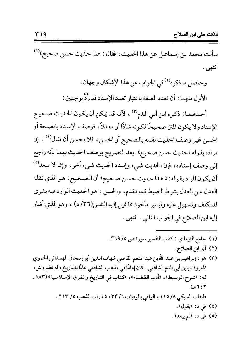 أَحدهمَا ذكره ابْن أبي الدَّم لِأَنَّهُ قد يُمكن أَن يكون الحَدِيث صَحِيح الْإِسْنَاد وَلَا يكون الْمَتْن صَحِيحا لكَونه شاذا أَو مُعَللا فوصف الْإِسْنَاد بِالصِّحَّةِ أَو الْحسن غير وصف الحَدِيث نَفسه بِالصَّحِيحِ أَو الْحسن فَلَا يحسن أَن يُقَال إِن مُرَاده بقوله حَدِيث حسن صَحِيح - بعد التَّصْرِيح بِوَصْف الحَدِيث بهما بِأَنَّهُ رَاجع إِلَى وصف إِسْنَاده فَإِن الحَدِيث شَيْء وَإسْنَاد الحَدِيث شَيْء آخر وَإِنَّمَا لَا يبعد أَن يكون المُرَاد بقوله هَذَا حَدِيث حسن صَحِيح أَن الصَّحِيح هُوَ الَّذِي نَقله الْعدْل عَن الْعدْل بِشَرْط الضَّبْط كَمَا تقدم وَالْحسن هُوَ الحَدِيث الْوَارِد فِيهِ بشرى للمكلف وتسهيل عَلَيْهِ وتيسير مَأْخُوذ مِمَّا تميل إِلَيْهِ النَّفس (36 / د) وَهُوَ الَّذِي أَشَارَ إِلَيْهِ ابْن الصّلاح فِي الْجَواب الثَّانِي انْتهى