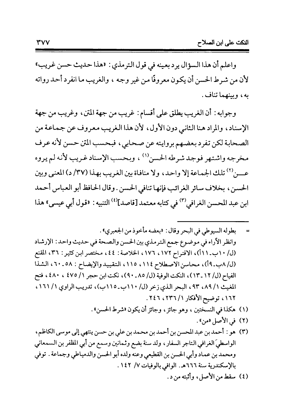 وَجَوَابه أَن الْغَرِيب يُطلق على أَقسَام غَرِيب من جِهَة الْمَتْن وغريب من جِهَة الْإِسْنَاد وَالْمرَاد هُنَا الثَّانِي دون الأول لِأَن هَذَا الْغَرِيب مَعْرُوف عَن جمَاعَة من الصَّحَابَة لَكِن تفرد بَعضهم بروايته عَن صَحَابِيّ فبحسب الْمَتْن حسن لِأَنَّهُ عرف مخرجه واشتهر فَوجدَ شَرطه الْحسن وبحسب الْإِسْنَاد غَرِيب لِأَنَّهُ لم يروه عَن تِلْكَ الْجَمَاعَة إِلَّا وَاحِد وَلَا مُنَافَاة بَين الْغَرِيب بِهَذَا (37 / د) الْمَعْنى وَبَين الْحسن بِخِلَاف سَائِر الغرائب فَإِنَّهَا تنَافِي الْحسن وَقَالَ الْحَافِظ أَبُو الْعَبَّاس أَحْمد ابْن عبد المحسن الغرافي فِي كِتَابه مُعْتَمد [قَاصد] التَّنْبِيه قَول أبي عِيسَى هَذَا