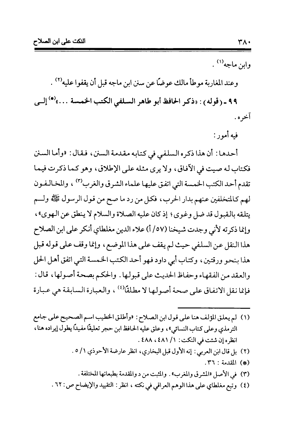 أَحدهَا أَن هَذَا ذكره السلَفِي فِي كِتَابه مُقَدّمَة السّنَن فَقَالَ وَأما السّنَن فكتاب لَهُ صيت فِي الْآفَاق وَلَا يرى مثله على الْإِطْلَاق وَهُوَ كَمَا ذكرت فِيمَا تقدم أحد الْكتب الْخَمْسَة الَّتِي اتّفق عَلَيْهَا عُلَمَاء الشرق والغرب والمخالفون لَهُم كالمتخلفين عَنْهُم بدار الْحَرْب فَكل من رد مَا صَحَّ من قَول الرَّسُول صلى الله عَلَيْهِ وَسلم وَلم يتلقه بِالْقبُولِ قد ضل وغوى إِذْ كَانَ عَلَيْهِ الصَّلَاة وَالسَّلَام لَا ينْطق عَن الْهوى وَإِنَّمَا ذكرته لِأَنِّي وجدت شَيخنَا (57 / أ) عَلَاء الدّين مغلطاي أنكر على ابْن الصّلاح هَذَا النَّقْل عَن السلَفِي حَيْثُ لم يقف على هَذَا الْموضع وَإِنَّمَا وقف على قَوْله قبل هَذَا بِنَحْوِ ورقتين وَكتاب أبي دَاوُد فَهُوَ أحد الْكتب الْخَمْسَة الَّتِي اتّفق أهل الْحل وَالْعقد من الْفُقَهَاء وحفاظ الحَدِيث على قبُولهَا وَالْحكم بِصِحَّة أُصُولهَا قَالَ فَإِنَّمَا نقل الِاتِّفَاق على صِحَة أُصُولهَا لَا مُطلقًا والعبارة السَّابِقَة هِيَ عبارَة