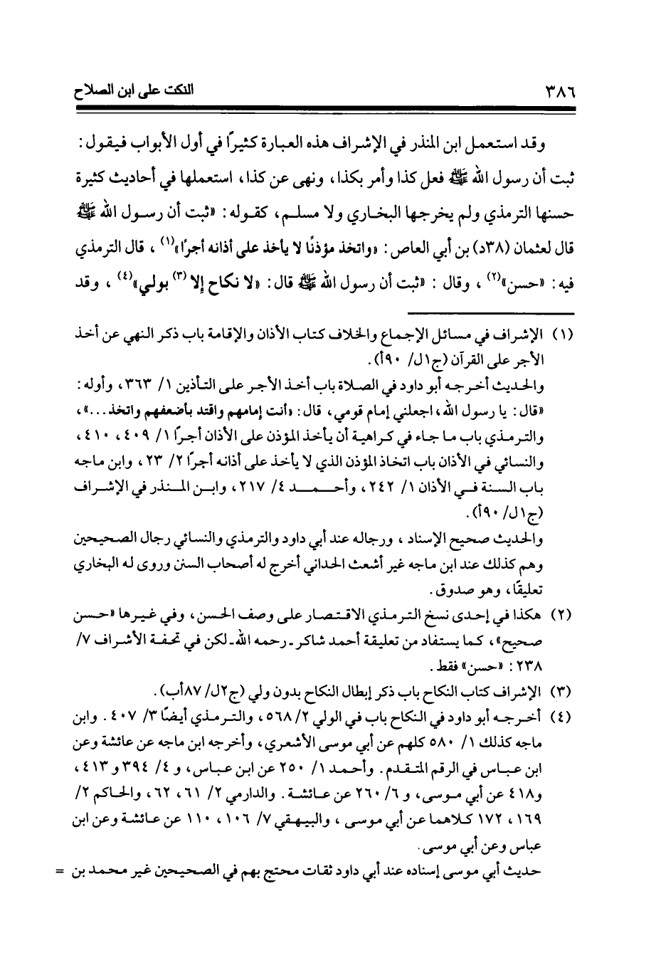 وَقد اسْتعْمل ابْن الْمُنْذر فِي الإشراف هَذِه الْعبارَة كثيرا فِي أول الْأَبْوَاب فَيَقُول ثَبت أَن رَسُول الله صلى الله عَلَيْهِ وَسلم فعل كَذَا وَأمر بِكَذَا وَنهى عَن كَذَا استعملها فِي أَحَادِيث كَثِيرَة حسنها التِّرْمِذِيّ وَلم يُخرجهَا البُخَارِيّ وَلَا مُسلم كَقَوْلِه ثَبت أَن رَسُول الله صلى الله عَلَيْهِ وَسلم قَالَ لعُثْمَان (38 د) بن أبي الْعَاصِ وَاتخذ مُؤذنًا لَا يَأْخُذ على أَذَانه أجرا قَالَ التِّرْمِذِيّ فِيهِ حسن وَقَالَ ثَبت أَن رَسُول الله صلى الله عَلَيْهِ وَسلم قَالَ لَا نِكَاح إِلَّا بولِي وَقد