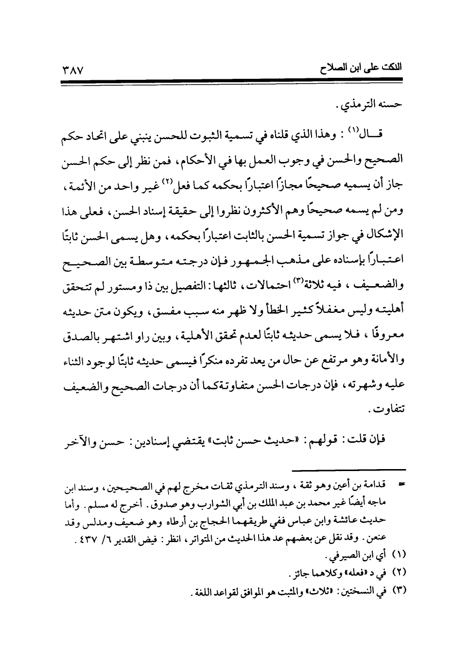 قَالَ وَهَذَا الَّذِي قُلْنَاهُ فِي تَسْمِيَة الثُّبُوت لِلْحسنِ يَنْبَنِي على اتِّحَاد حكم الصَّحِيح وَالْحسن فِي وجوب الْعَمَل بهَا فِي الْأَحْكَام فَمن نظر إِلَى حكم الْحسن جَازَ أَن يُسَمِّيه صَحِيحا مجَازًا اعْتِبَارا بِحكمِهِ كَمَا فعل غير وَاحِد من الْأَئِمَّة وَمن لم يسمه صَحِيحا وهم الْأَكْثَرُونَ نظرُوا إِلَى حَقِيقَة إِسْنَاد الْحسن فعلى هَذَا الْإِشْكَال فِي جَوَاز تَسْمِيَة الْحسن بالثابت اعْتِبَارا بِحكمِهِ وَهل يُسمى الْحسن ثَابتا اعْتِبَارا بِإِسْنَادِهِ على مَذْهَب الْجُمْهُور فَإِن دَرَجَته متوسطة بَين الصَّحِيح والضعيف فِيهِ ثَلَاثَة احتمالات ثَالِثهَا التَّفْصِيل بَين ذَا ومستور لم تتَحَقَّق أَهْلِيَّته وَلَيْسَ مغفلا كثير الْخَطَأ وَلَا ظهر مِنْهُ سَبَب مفسق وَيكون متن حَدِيثه مَعْرُوفا فَلَا يُسمى حَدِيثه ثَابتا لعدم تَحْقِيق الْأَهْلِيَّة وَبَين راو اشْتهر بِالصّدقِ وَالْأَمَانَة وَهُوَ مُرْتَفع عَن حَال من يعد تفرده مُنْكرا فيسمى حَدِيثه ثَابتا لوُجُود الثَّنَاء عَلَيْهِ وشهرته فَإِن دَرَجَات الْحسن مُتَفَاوِتَة كَمَا أَن دَرَجَات الصَّحِيح والضعيف تَتَفَاوَت
