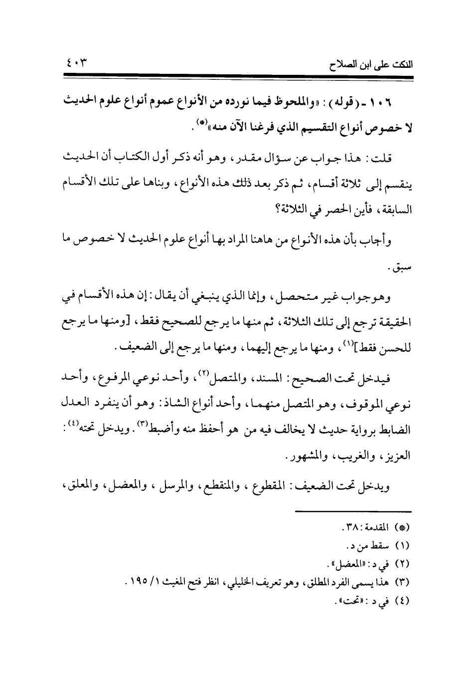 106 - (قَوْله) والملحوظ فِيمَا نورده من الْأَنْوَاع عُمُوم أَنْوَاع عُلُوم الحَدِيث لَا خُصُوص أَنْوَاع التَّقْسِيم الَّذِي فَرغْنَا الْآن مِنْهُ