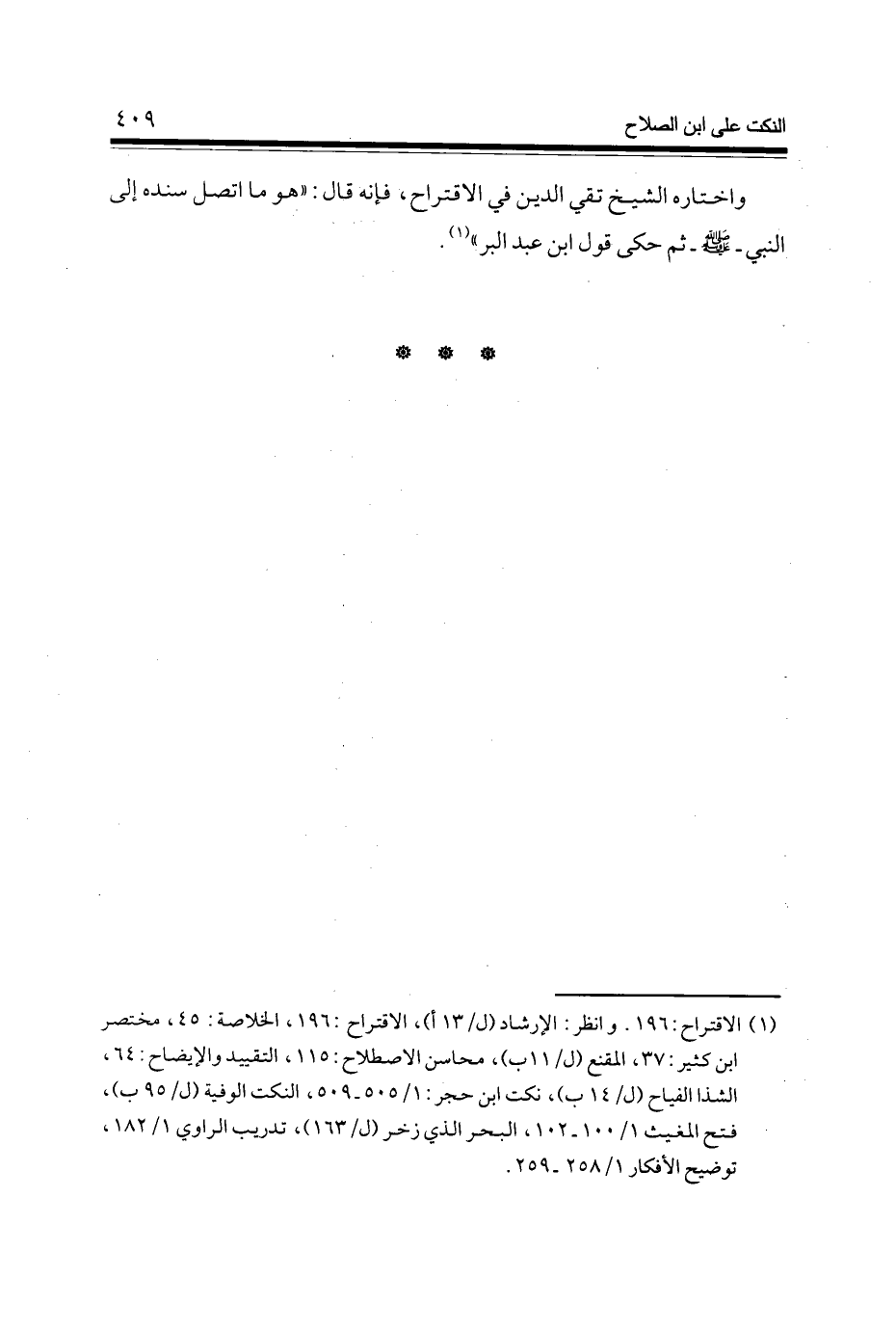 وَاخْتَارَهُ الشَّيْخ تَقِيّ الدّين فِي الاقتراح فَإِنَّهُ قَالَ هُوَ مَا اتَّصل سَنَده إِلَى النَّبِي - صلى الله عَلَيْهِ وَسلم - ثمَّ حكى قَول ابْن عبد الْبر