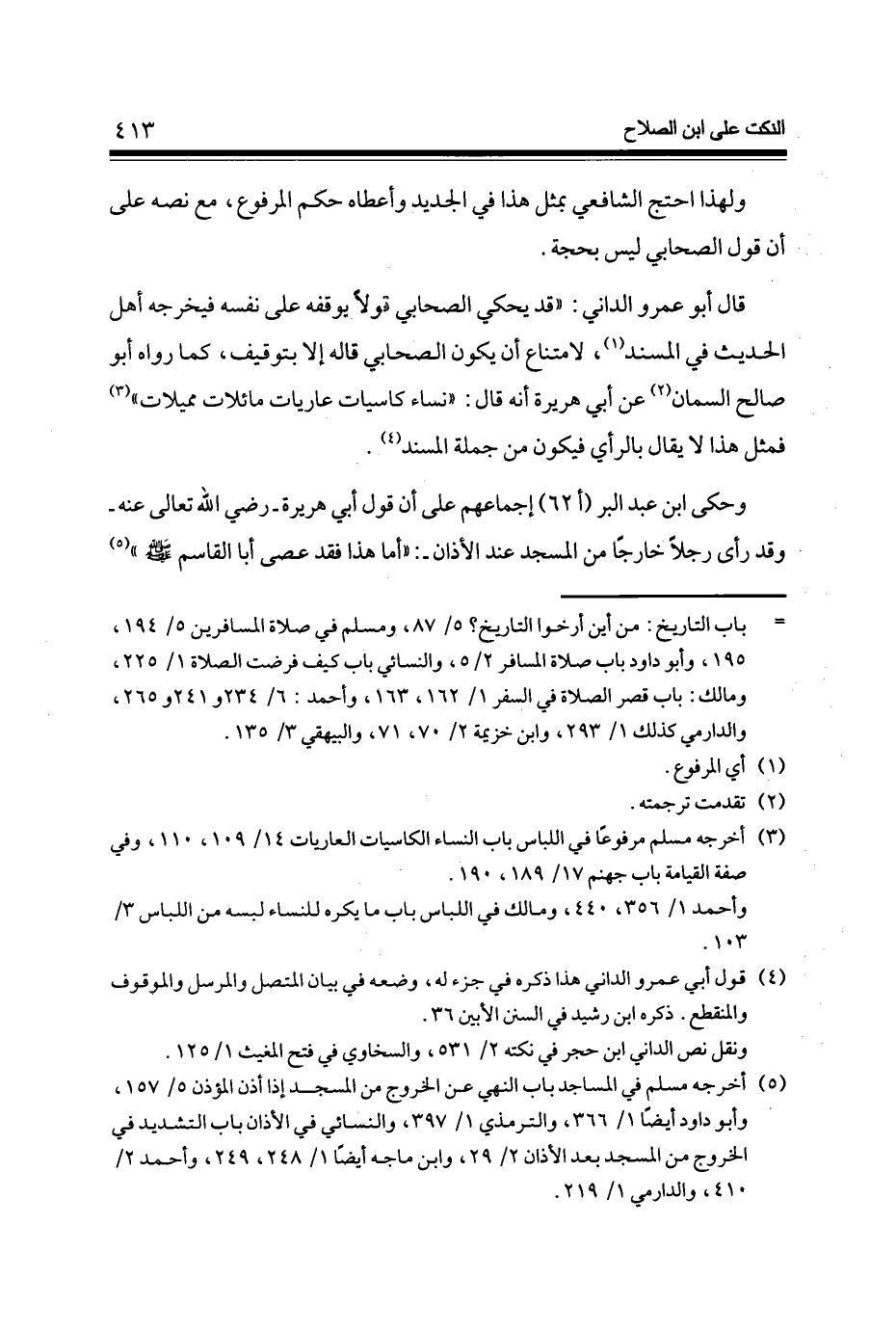 قَالَ أَبُو عَمْرو الداني قد يَحْكِي الصَّحَابِيّ قولا يوقفه على نَفسه فيخرجه أهل الحَدِيث فِي الْمسند لِامْتِنَاع أَن يكون الصَّحَابِيّ قَالَه إِلَّا بتوقيف كَمَا رَوَاهُ أَبُو صَالح السمان عَن أبي هُرَيْرَة أَنه قَالَ نسَاء كاسيات عاريات مائلات مميلات فَمثل هَذَا لَا يُقَال بِالرَّأْيِ فَيكون من جملَة الْمسند