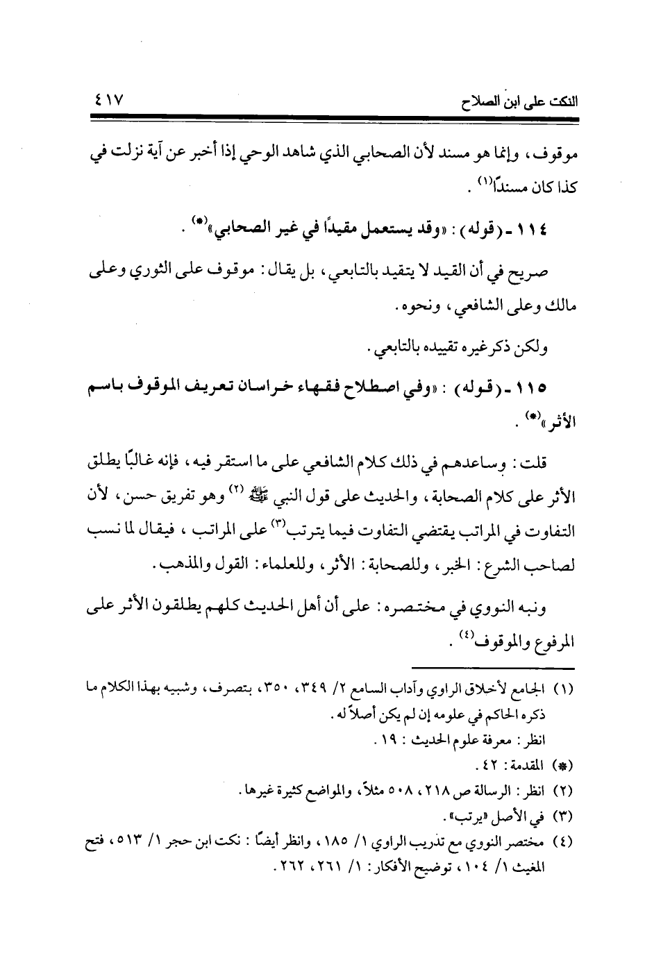 صَرِيح فِي أَن الْقَيْد لَا يتَقَيَّد بالتابعي بل يُقَال مَوْقُوف على الثَّوْريّ وعَلى مَالك وعَلى الشَّافِعِي وَنَحْوه