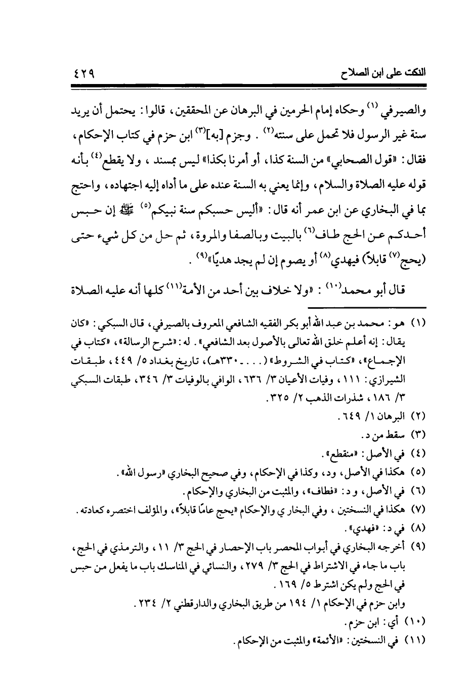 والصيرفي وَحَكَاهُ إِمَام الْحَرَمَيْنِ فِي الْبُرْهَان عَن الْمُحَقِّقين قَالُوا يحْتَمل أَن يُرِيد سنة غير الرَّسُول فَلَا تحمل على سنته وَجزم [بِهِ] ابْن حزم فِي كتاب الإحكام فَقَالَ قَول الصَّحَابِيّ من السّنة كَذَا أَو أمرنَا بِكَذَا لَيْسَ بِمُسْنَد وَلَا يقطع بِأَنَّهُ قَوْله عَلَيْهِ الصَّلَاة وَالسَّلَام وَإِنَّمَا يَعْنِي بِهِ السّنة عِنْده على مَا أَدَّاهُ إِلَيْهِ اجْتِهَاده وَاحْتج بِمَا فِي البُخَارِيّ عَن ابْن عمر أَنه قَالَ أَلَيْسَ حسبكم سنة نَبِيكُم صلى الله عَلَيْهِ وَسلم إِن حبس أحدكُم عَن الْحَج طَاف بِالْبَيْتِ وبالصفا والمروة ثمَّ حل من كل شَيْء حَتَّى (يحجّ قَابلا) فيهدي أَو يَصُوم إِن لم يجد هَديا