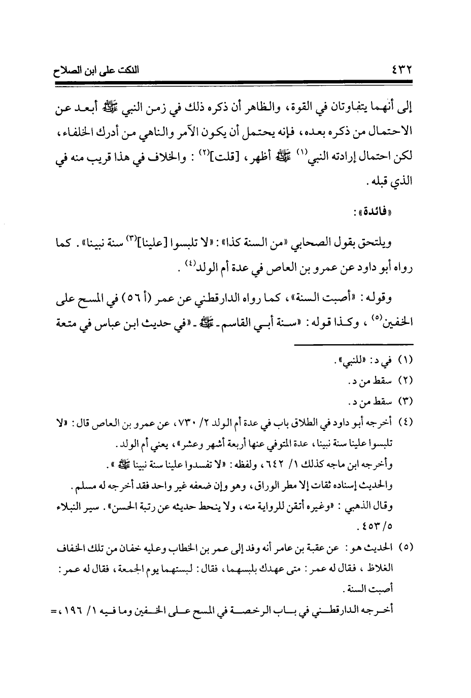 وَقَوله أصبت السّنة كَمَا رَوَاهُ الدَّارَقُطْنِيّ عَن عمر (أ 56) فِي الْمسْح على الْخُفَّيْنِ وَكَذَا قَوْله سنة أبي الْقَاسِم - صلى الله عَلَيْهِ وَسلم - فِي حَدِيث ابْن عَبَّاس فِي مُتْعَة