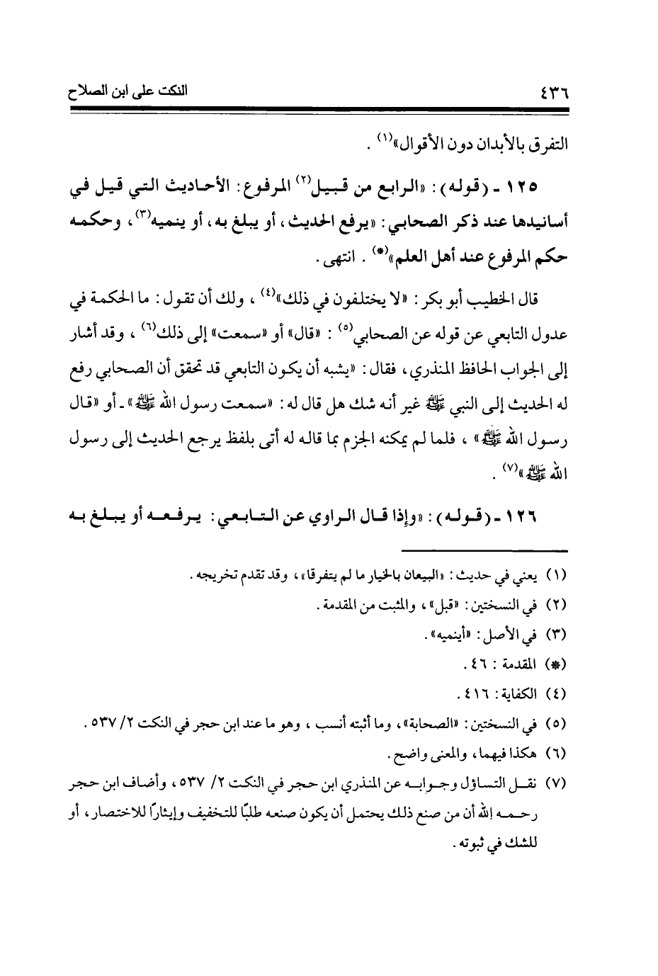 125 - (قَوْله) الرَّابِع من قبيل الْمَرْفُوع الْأَحَادِيث الَّتِي قيل فِي أسانيدها عِنْد ذكر الصَّحَابِيّ يرفع الحَدِيث أَو يبلغ بِهِ أَو ينميه وَحكمه حكم الْمَرْفُوع عِنْد أهل الْعلم انْتهى
