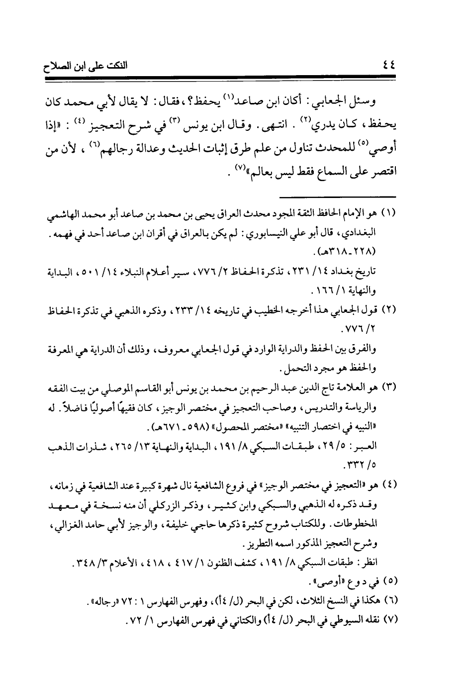 وَسُئِلَ الجعابي أَكَانَ ابْن صاعد يحفظ فَقَالَ لَا يُقَال لأبي مُحَمَّد كَانَ يحفظ كَانَ يدْرِي انْتهى وَقَالَ ابْن يُونُس فِي شرح التَّعْجِيز إِذا أوصِي للمحدث تنَاول من علم طرق إِثْبَات الحَدِيث وعدالة رِجَالهمْ لِأَن من اقْتصر على السماع فَقَط لَيْسَ بعالم