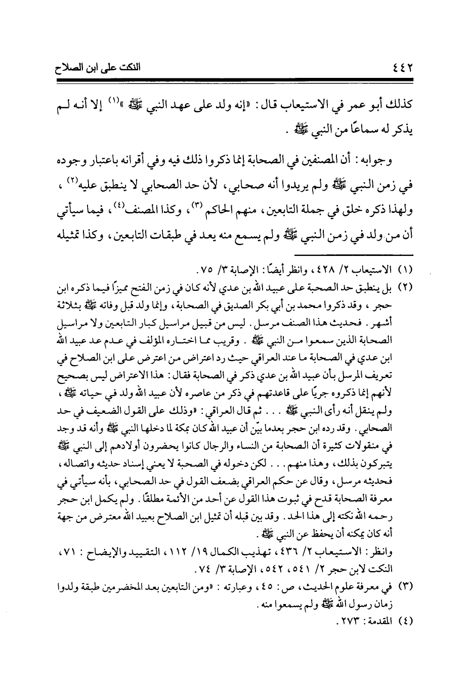 وَجَوَابه أَن المصنفين فِي الصَّحَابَة إِنَّمَا ذكرُوا ذَلِك فِيهِ وَفِي أقرانه بِاعْتِبَار وجوده فِي زمن النَّبِي صلى الله عَلَيْهِ وَسلم وَلم يُرِيدُوا أَنه صَحَابِيّ لِأَن حد الصَّحَابِيّ لَا ينطبق عَلَيْهِ وَلِهَذَا ذكره خلق فِي جملَة التَّابِعين مِنْهُم الْحَاكِم وَكَذَا المُصَنّف فِيمَا سَيَأْتِي أَن من ولد فِي زمن النَّبِي صلى الله عَلَيْهِ وَسلم وَلم يسمع مِنْهُ يعد فِي طَبَقَات التَّابِعين وَكَذَا تمثيله