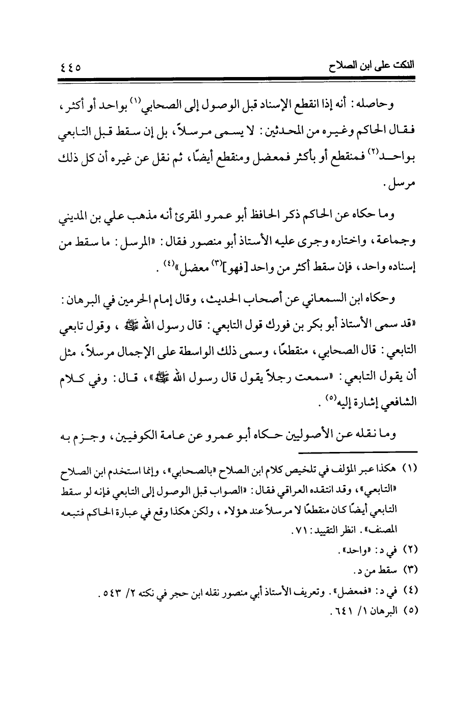 وَمَا حَكَاهُ عَن الْحَاكِم ذكر الْحَافِظ أَبُو عَمْرو الْمُقْرِئ أَنه مَذْهَب عَليّ بن الْمَدِينِيّ وَجَمَاعَة وَاخْتَارَهُ وَجرى عَلَيْهِ الْأُسْتَاذ أَبُو مَنْصُور فَقَالَ الْمُرْسل مَا سقط من إِسْنَاده وَاحِد فَإِن سقط أَكثر من وَاحِد [فَهُوَ] معضل