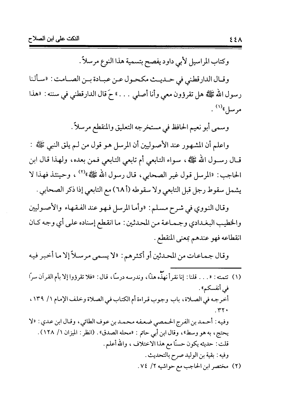 وَاعْلَم أَن الْمَشْهُور عِنْد الْأُصُولِيِّينَ أَن الْمُرْسل هُوَ قَول من لم يلق النَّبِي صلى الله عَلَيْهِ وَسلم قَالَ رَسُول الله صلى الله عَلَيْهِ وَسلم سَوَاء التَّابِعِيّ أم تَابِعِيّ التَّابِعِيّ فَمن بعده وَلِهَذَا قَالَ ابْن الْحَاجِب الْمُرْسل قَول غير الصَّحَابِيّ قَالَ رَسُول الله صلى الله عَلَيْهِ وَسلم وَحِينَئِذٍ فَهَذَا لَا يَشْمَل سُقُوط رجل قبل التَّابِعِيّ وَلَا سُقُوطه (أ 68) مَعَ التَّابِعِيّ إِذا ذكر الصَّحَابِيّ