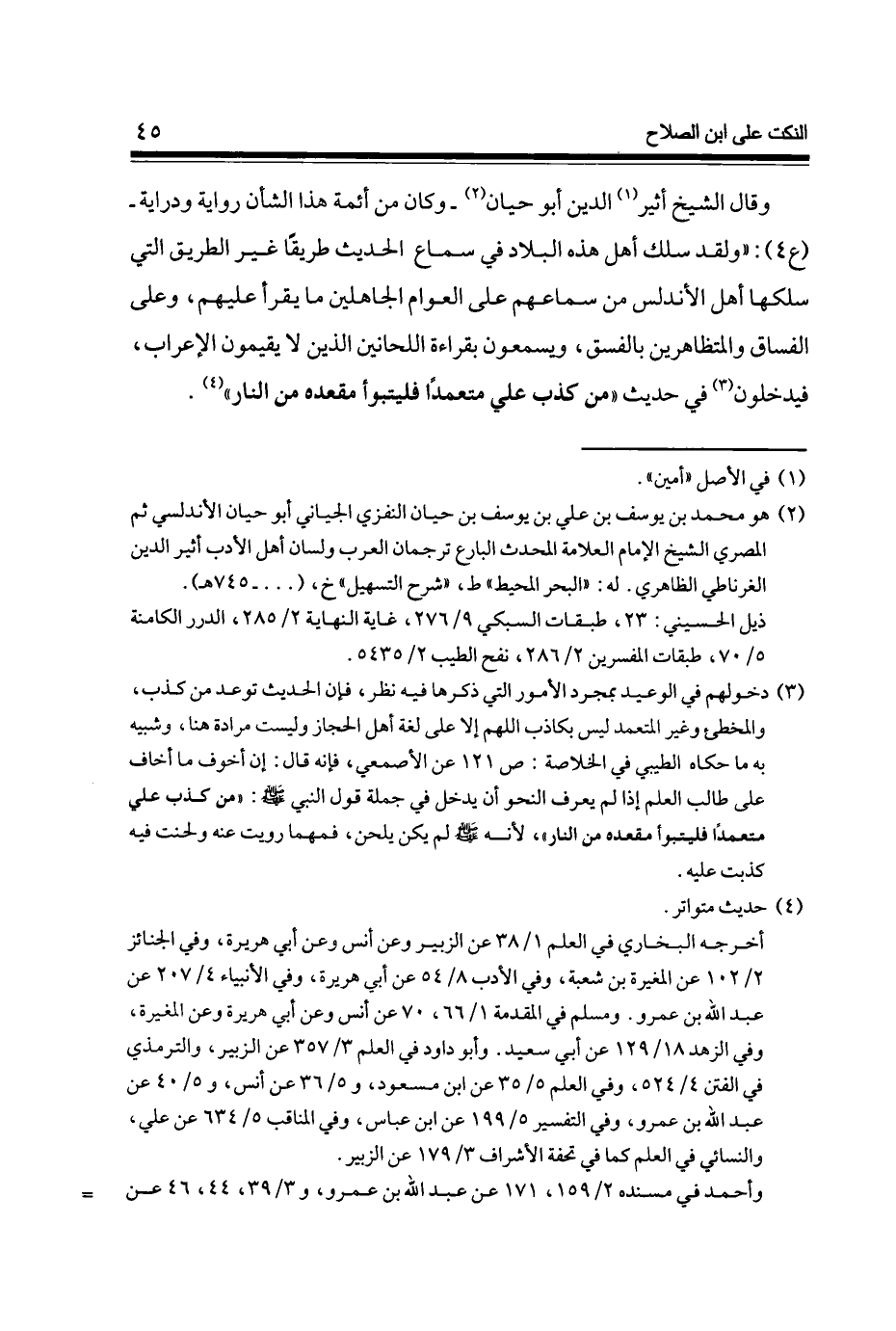 وَقَالَ الشَّيْخ أثير الدّين أَبُو حَيَّان - وَكَانَ من أَئِمَّة هَذَا الشَّأْن رِوَايَة ودراية - (ع 4) وَلَقَد سلك أهل هَذِه الْبِلَاد فِي سَماع الحَدِيث طَرِيقا غير الطَّرِيق الَّتِي سلكها أهل الأندلس من سماعهم على الْعَوام الْجَاهِلين مَا يقْرَأ عَلَيْهِم وعَلى الْفُسَّاق والمتظاهرين بِالْفِسْقِ ويسمعون بِقِرَاءَة اللحانين الَّذين لَا يُقِيمُونَ الْإِعْرَاب فَيدْخلُونَ فِي حَدِيث من كذب عَليّ مُتَعَمدا فَليَتَبَوَّأ مَقْعَده من النَّار