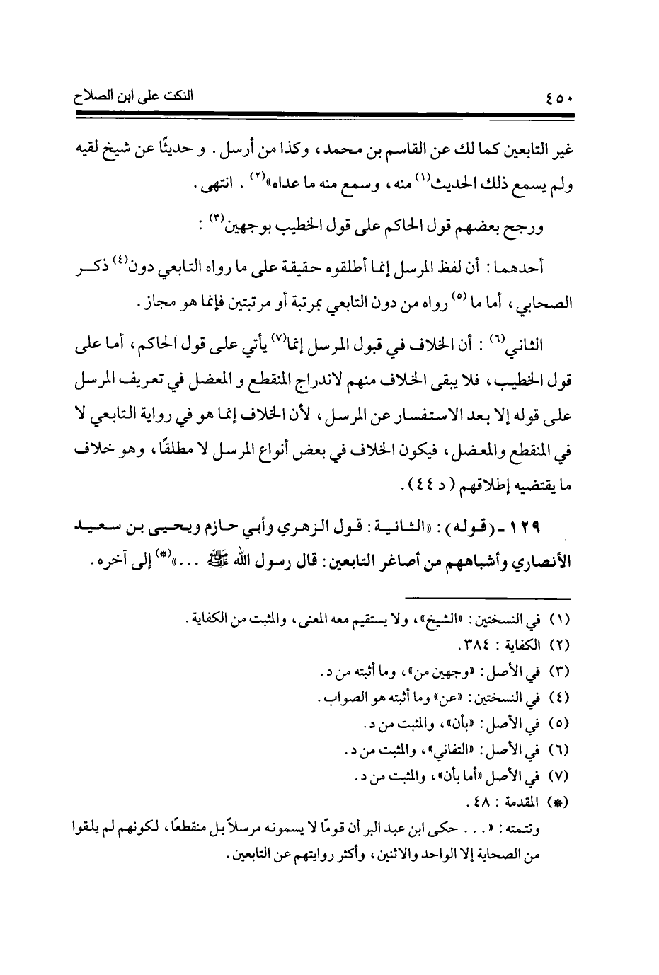 129 - (قَوْله) الثَّانِيَة قَول الزُّهْرِيّ وَأبي حَازِم وَيحيى بن سعيد الْأنْصَارِيّ وأشباههم من أصاغر التَّابِعين قَالَ رَسُول الله صلى الله عَلَيْهِ وَسلم إِلَى آخِره