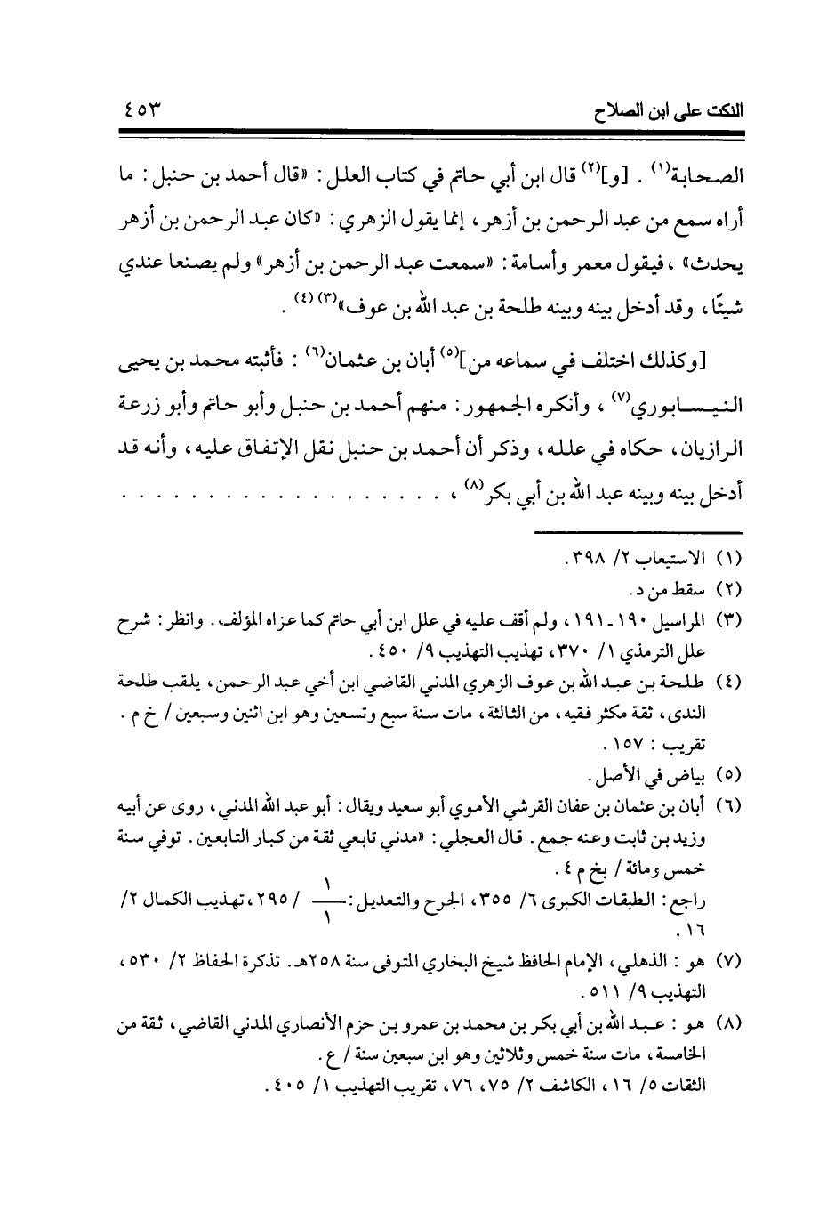 الصَّحَابَة [و] قَالَ ابْن أبي حَاتِم فِي كتاب الْعِلَل قَالَ أَحْمد بن حَنْبَل مَا أرَاهُ سمع من عبد الرَّحْمَن بن أَزْهَر إِنَّمَا يَقُول الزُّهْرِيّ كَانَ عبد الرَّحْمَن بن أَزْهَر يحدث فَيَقُول معمر وَأُسَامَة سَمِعت عبد الرَّحْمَن بن أَزْهَر وَلم يصنعا عِنْدِي شَيْئا وَقد أَدخل بَينه وَبَينه طَلْحَة بن عبد الله بن عَوْف